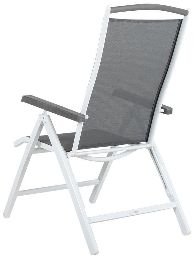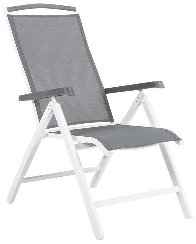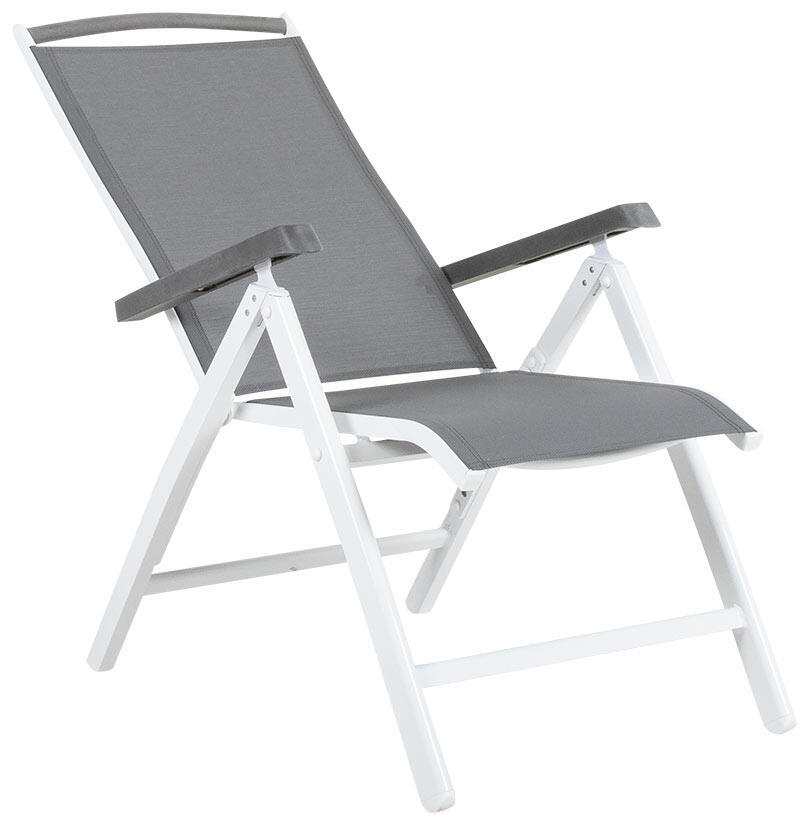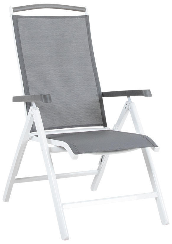 Stolen har reglerbar rygg och kan fällas ihop för smidig och praktisk förvaring. Den här modellen har stomme i blankvit aluminium, sits och rygg i grå vädertålig textilene, rostfria skruvar och beslag, armstöd och övre delen av ryggen i nonwood.