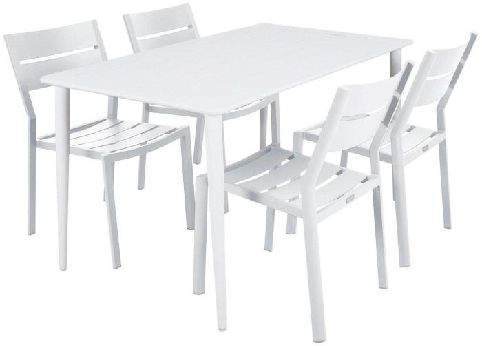 Matgrupp bestående av Nimes matbord 140x78 cm och fyra stycken Delia matstolar. Välj på flera färger av mattlackad aluminium. Komplettera gärna med sittdynor för bästa komfort.