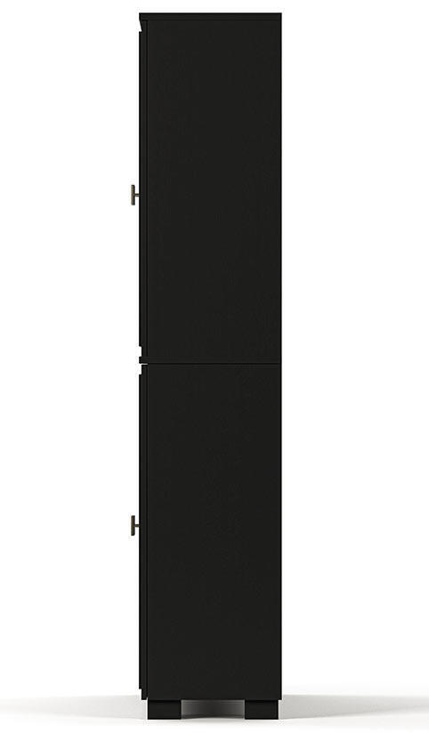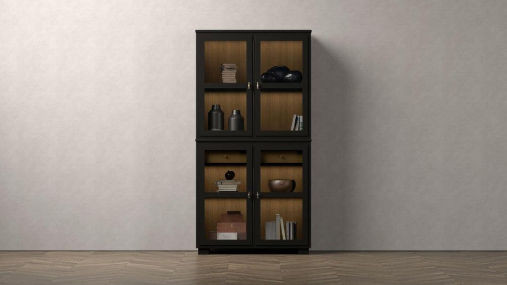 Skåpet är uppdelat i två delar, ett underskåp och ett överskåp. Den stabila basen består av en skänk med två glasdörrar. Bakom varje dörr döljs en hylla och låda för smart förvaring. Ovanpå är ett överskåp som har samma innehåll förutom lådor. Tillsammans ger utrymmena dig möjlighet att anpassa förvaringen på ett bra sätt.