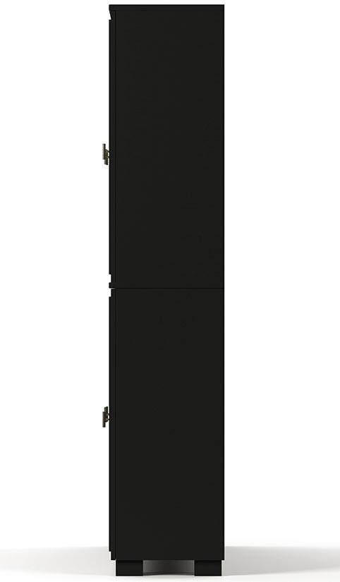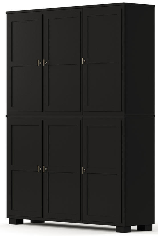 Skåpet är uppdelat i två delar, ett underskåp och ett överskåp. Den stabila basen består av en skänk med totalt tre trädörrar, en dubbeldörr och en enkeldörr. Bakom varje dörrparti döljs en hylla och en låda för smart förvaring. Ovanpå är ett överskåp som har samma innehåll förutom lådor. Tillsammans ger utrymmena dig möjlighet att anpassa förvaringen på ett bra sätt.