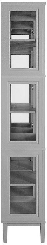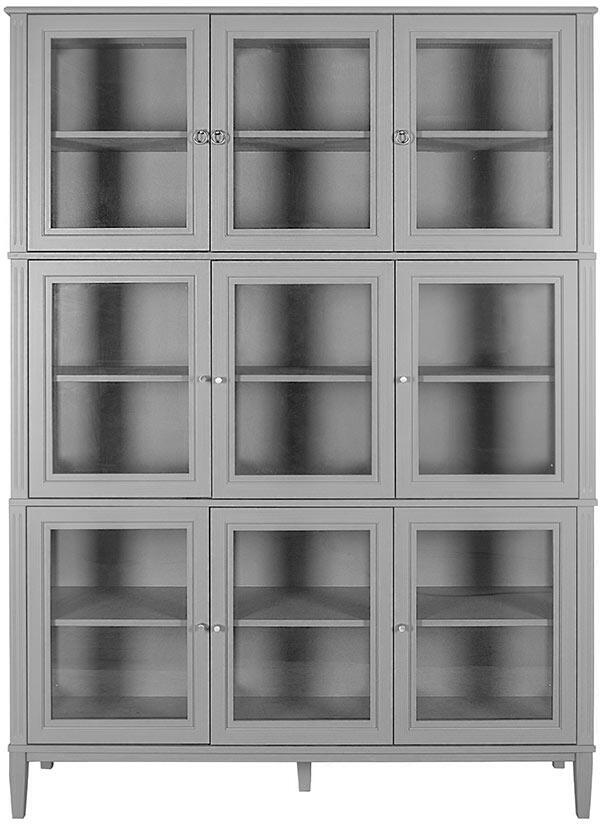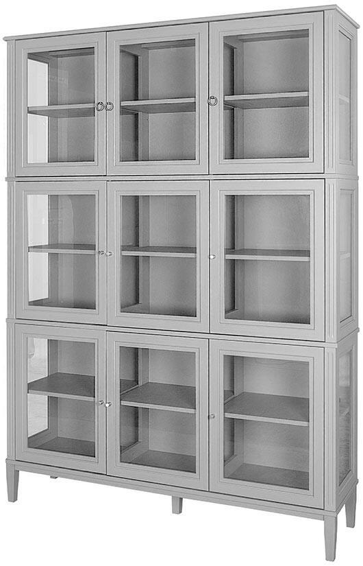 En del av serien är detta stapelbara vitrinskåp som kan beställas med 1, 2, 3 eller 4 sektioner. Den här artikeln är vitrinskåpet med 3-sektioner, det vill säga tre våningar. Förvaringsmöbeln levereras med totalt nio glasdörrar med en trähylla bakom varje dörr och skåpet har sidor av glas. Toppskiva och benställning medföljer.