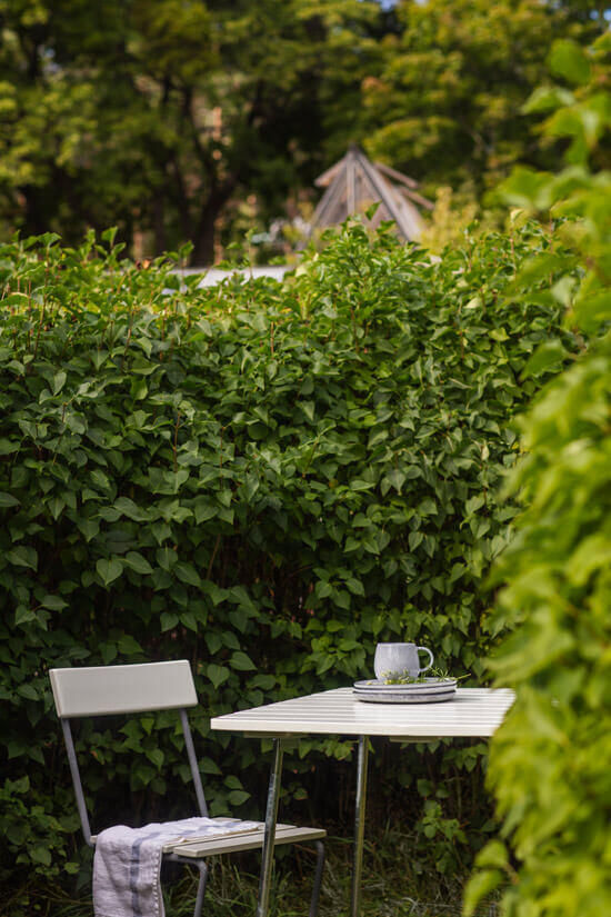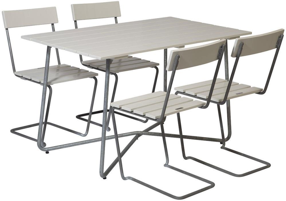 Matgrupp till uteplatsen bestående av det klassiska bordet B25A 120x70 cm med fyra stycken Stol 1 från Grythyttan Stålmöbler. Bordet tillsammans med de skönt sviktande stolarna är den perfekta trädgårdsgruppen för alla tillfällen.