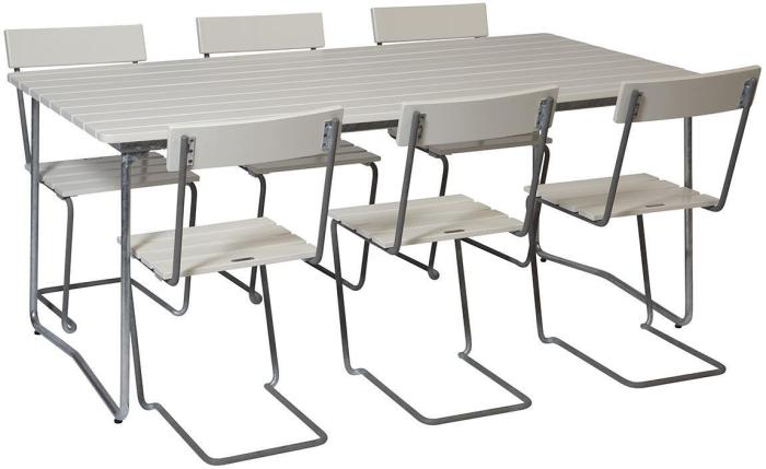 Matgrupp till uteplatsen bestående av det klassiska bordet B31 170x92 cm med sex stycken Stol 1 från Grythyttan Stålmöbler. Bordet tillsammans med de skönt sviktande stolarna är den perfekta trädgårdsgruppen för alla tillfällen.