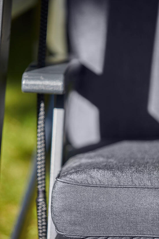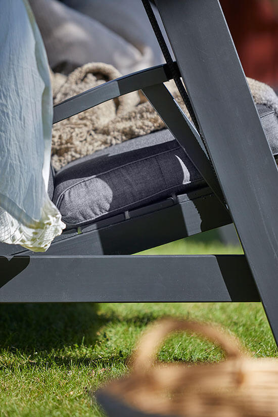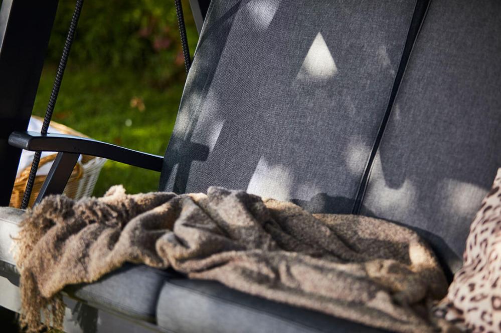 Till hammocken ingår grått tak och tjocka dynor med en klädsel av tålig och slitstark panama. En polyestermix som är 100% återvunnen. Ett slitstarkt tyg med hög vattenavvisande yta. Panama är även antibakteriell och har hög tålighet mot klorerat vatten, vilket passar utmärkt i närheten av pooler och spabad. UV-beständighet 7-8/8.