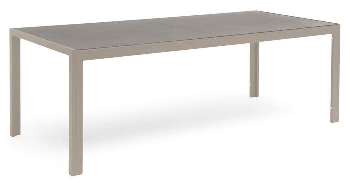 Hånger matbord från Hillerstorp, i underhållsfri sandfärgad aluminium med en bordsskiva i varmgrå melerad keramiskt glas, 8 mm tjock. Bordet finns i storlekarna 140x90 och 210x90 cm.