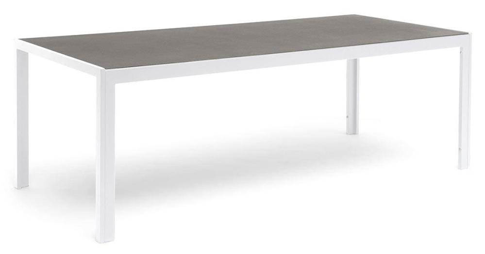 Hånger matbord från Hillerstorp, i underhållsfri vit aluminium med en bordsskiva i varmgrå melerad keramiskt glas, 8 mm tjock. Bordet finns i storlekarna 140x90 och 210x90 cm.