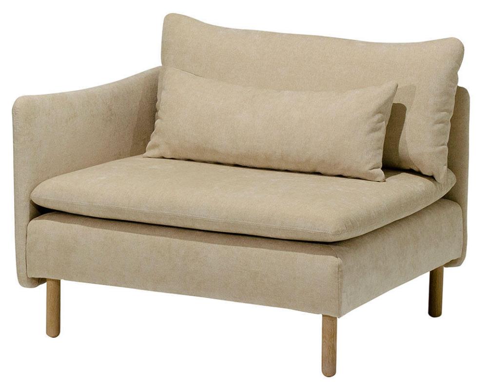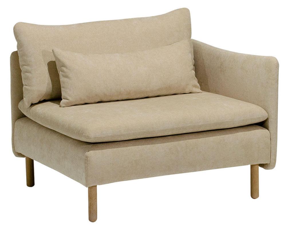 Den här artikeln består av en 1-sits med ett armstöd på valfri sida, inklusive dynor, valfria ben och tyg. På frilagd produktbild visas tyg Elba Natural med vitoljade ekben.