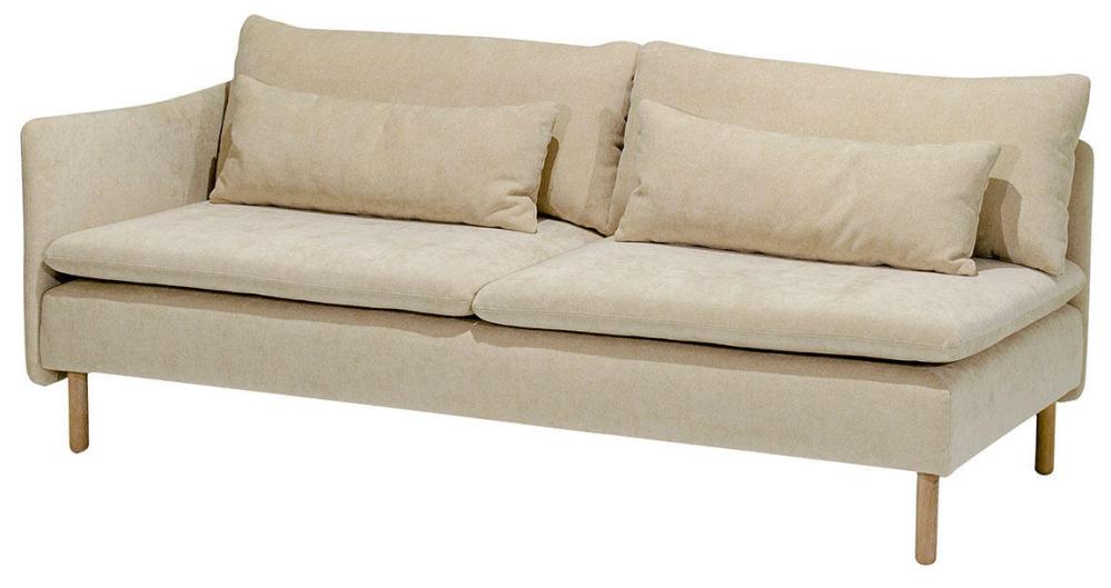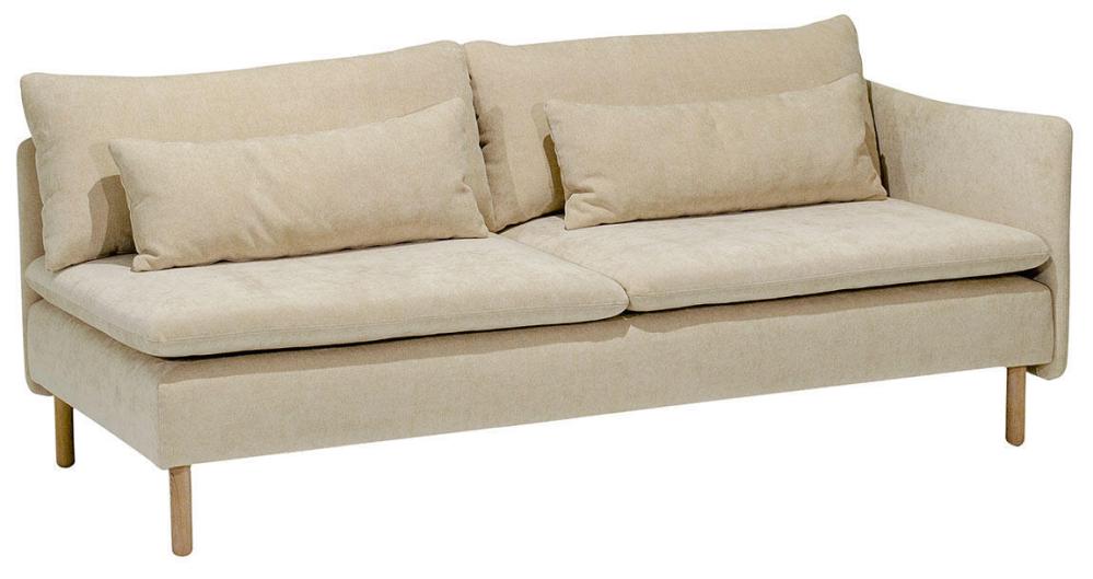 Den här artikeln består av en 3-sits med delad dyna och ett armstöd på valfri sida, inklusive dynor, valfria ben och tyg. På frilagd produktbild visas tyg Elba Natural med vitoljade ekben.