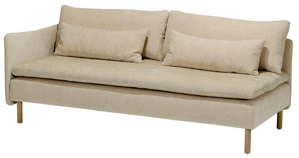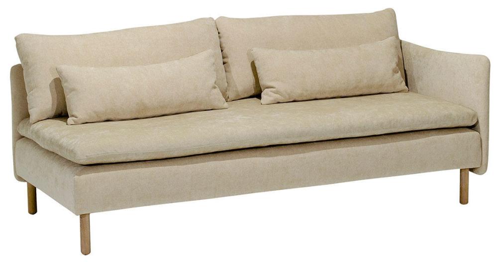 Den här artikeln består av en 3-sits med hel dyna och ett armstöd på valfri sida, inklusive dynor, valfria ben och tyg. På frilagd produktbild visas tyg Elba Natural med vitoljade ekben.