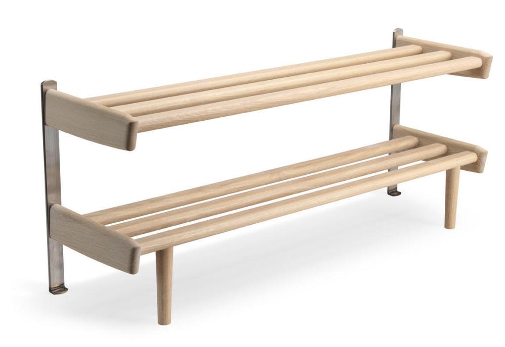 Skohylla Meja, golvmodell med 2 hyllplan och detaljer i slipat stål. Skohyllan är tillverkad i massiv ek eller vitlackad massiv björk. Nu har Oscarssons Möbel designat en hallmöbel med en korsning av klassisk och nyskapande form. Deras styrka ligger i valen av material, sinne för detaljer och passion för design.