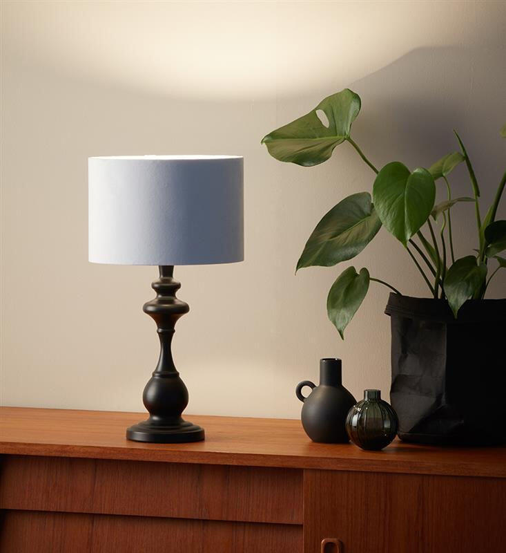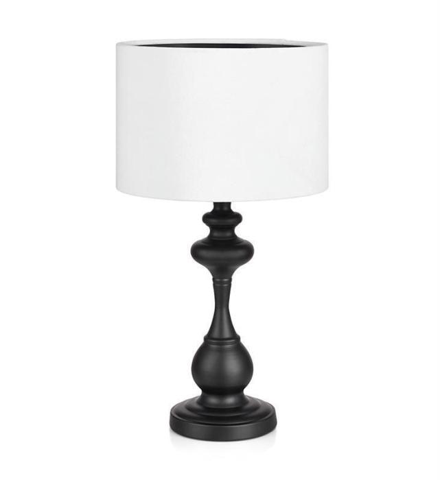 Connor bordslampa från Markslöjd. Fot i svart metall med skärm i vit sammet. 2m svart textilklädd sladd med strömbrytare. Stor lamphållare (E27). Max 60W glödlampa eller motsvarande styrka i halogen, lågenergi eller LED. Ljuskälla medföljer ej.