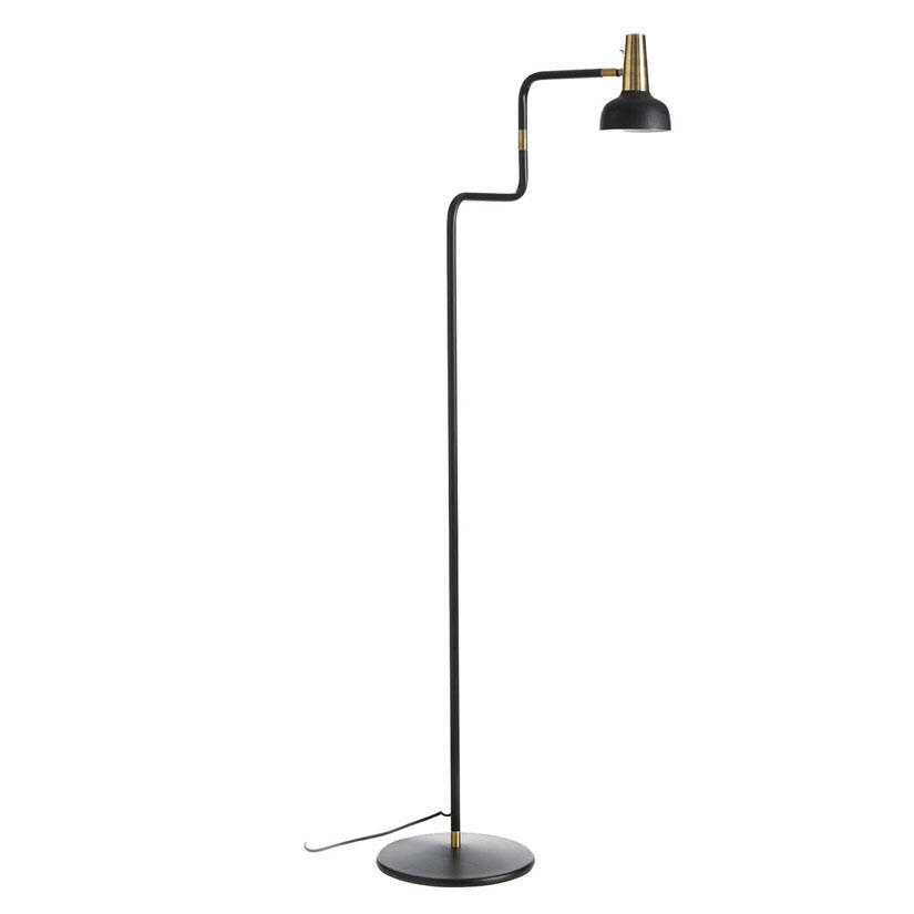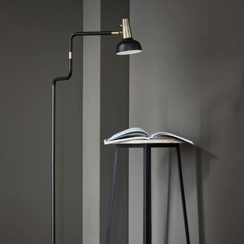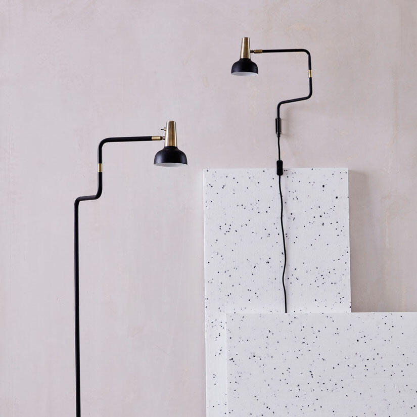 Ray är en justerbar golvlampa i vit eller svart med mässings- eller nickeldetaljer.