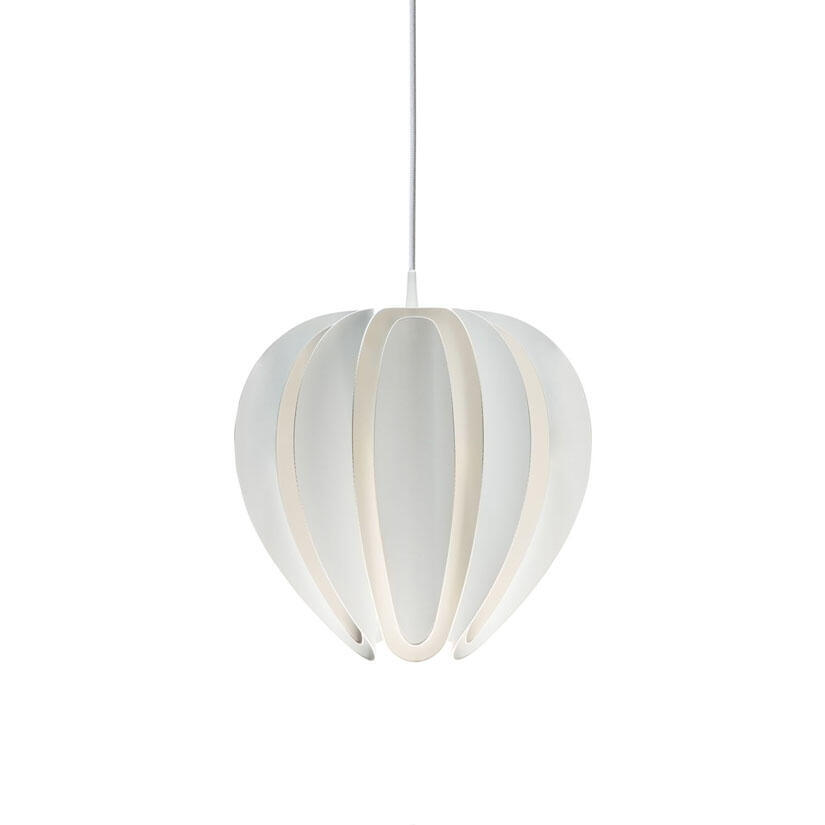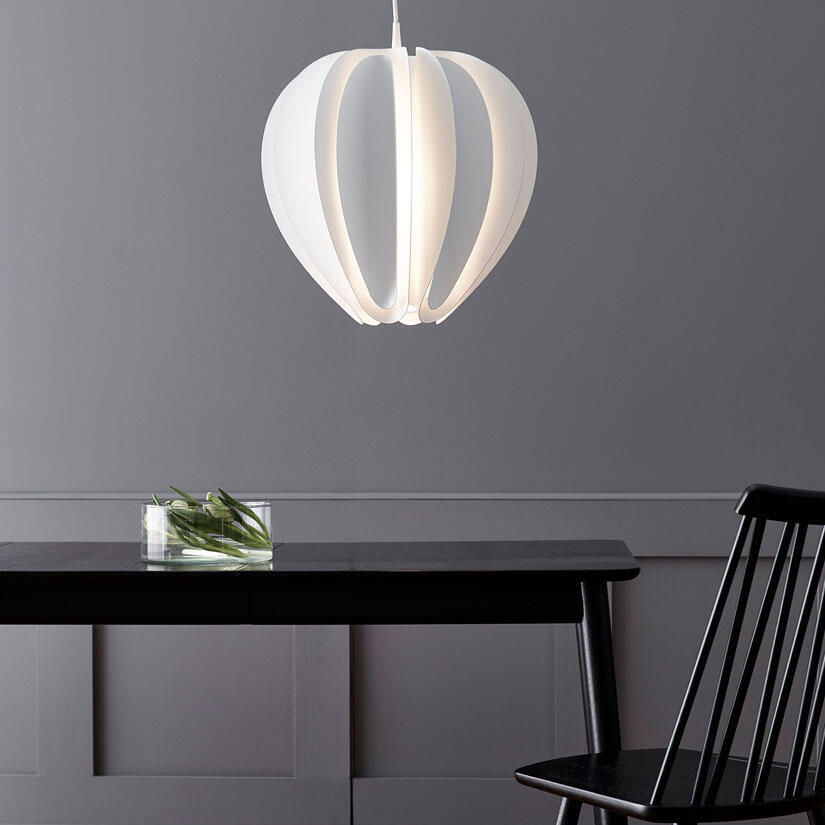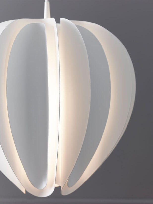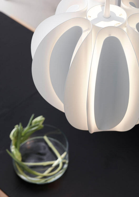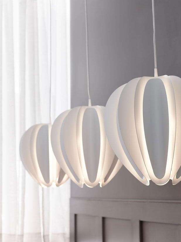 Noggrant böjda metallnyanser i skikt omger ljuset, vilket gör att ljuset sprider sig vackert i rummet. Formad som en blomma flyter Tulpan i rummet och kastar ljus i alla riktningar. Ljuset som reflekterar på de krökta formerna ger en inspirerande vy.