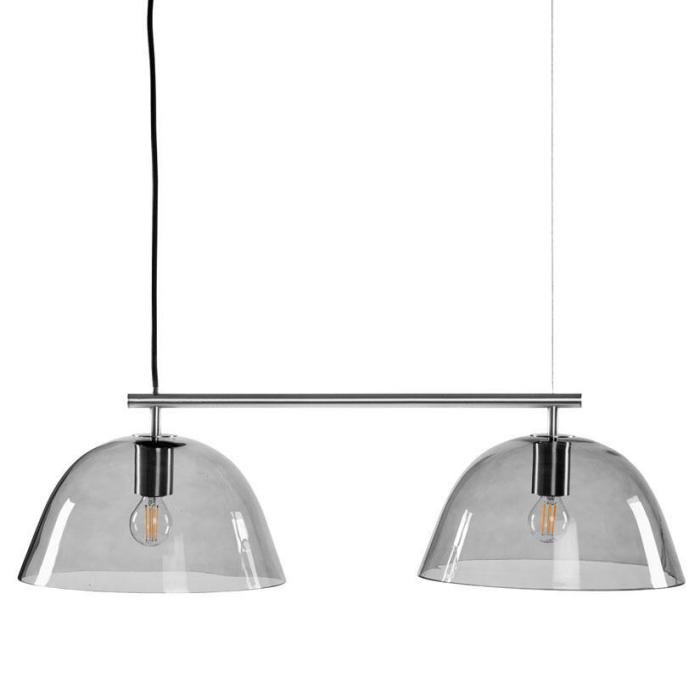 Taklampan Wendo 70 är designad av Monika Mulder för CO Bankeryd. Pendeln har två rökfärgade glaskupor som hänger på en strikt metallskena i tre olika färger. Den stilrena taklampan passar perfekt ovanför ett längre matsalsbord där den får ta sin plats och samtidigt sprida ett vackert ljus genom de rökfärgade glasen som ger ett behagligt och stämningsfullt ljus. Lampan hängs enkelt upp i taket, på ena sidan löper en 1,5m lång textilkabel. Två E14 ljuskällor köps separat med maxwatt 6W.