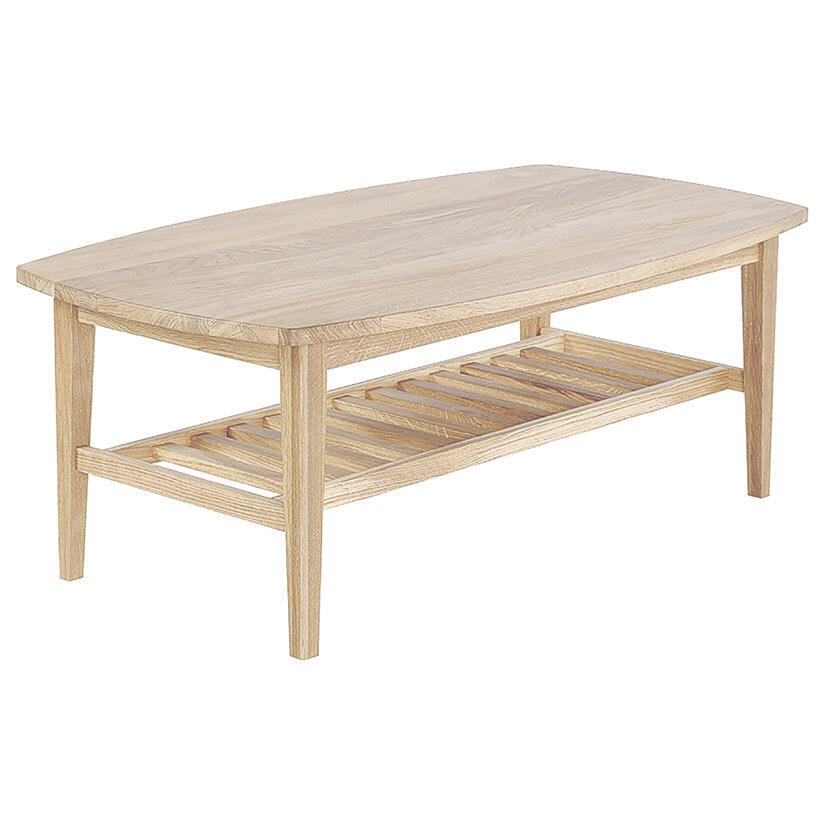 Soffbordet Allegro har en stilren formgivning, oval form med bågformade kanter som ger ett stilfullt uttryck. Det massiva ekbordet har ett toppskikt av faner. Bordet kan väljas i naturell- eller vitolja. Vardagsrumsbordet har en praktisk underhylla.