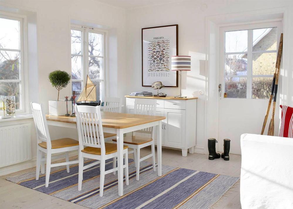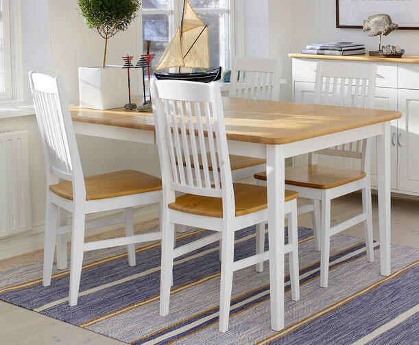 Boden matgrupp med matbord 140x90 cm och fyra stycken stolar från samma matsalsserie. Boden har ett klassiskt utförande med massiv klarlackad björkskiva med vit stomme/underrede. I priset ingår 1 iläggsskiva på 45x90 cm som gör det möjligt att enkelt utöka bordet till sex rymliga sittplatser, två extra stolar kan smidigt kompletteras till beställningen och ditt hem.