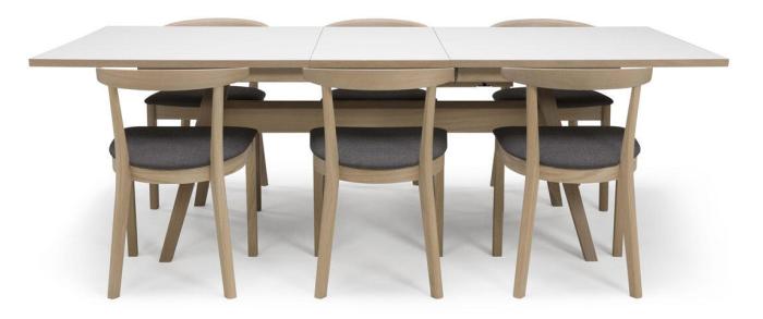 Matbordet Bornholm är ett stilrent och trendigt bord med smart mekanism. Iläggsskivorna förvaras inuti bordet, viks upp med ett lätt handgrepp. Med bordet maximalt utfällt får det plats 8 personer runt bordet. Bornholm matbord i vit laminat med vitoljad ek kant och underrede L183/274 B100 H74 cm, inkl. 2 st iläggsskivor med butterflykonstruktion á 45 cm. Århus stol i mörkgrått tyg och vitoljad ek B50 D50 H75 cm. Matgruppen inkluderar bord och 6 stolar!