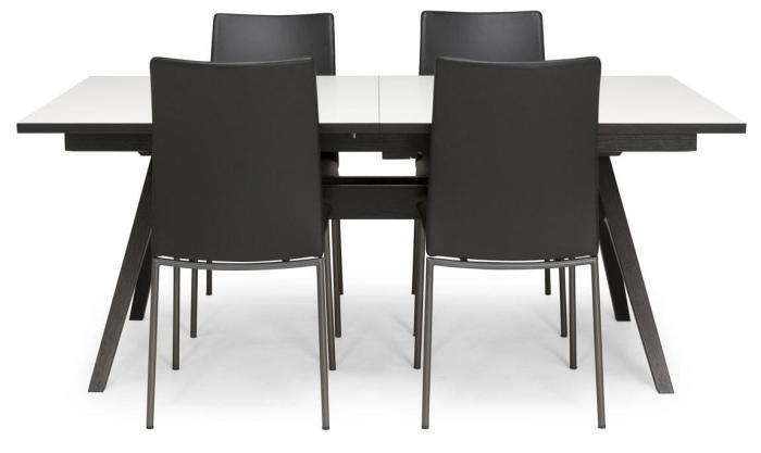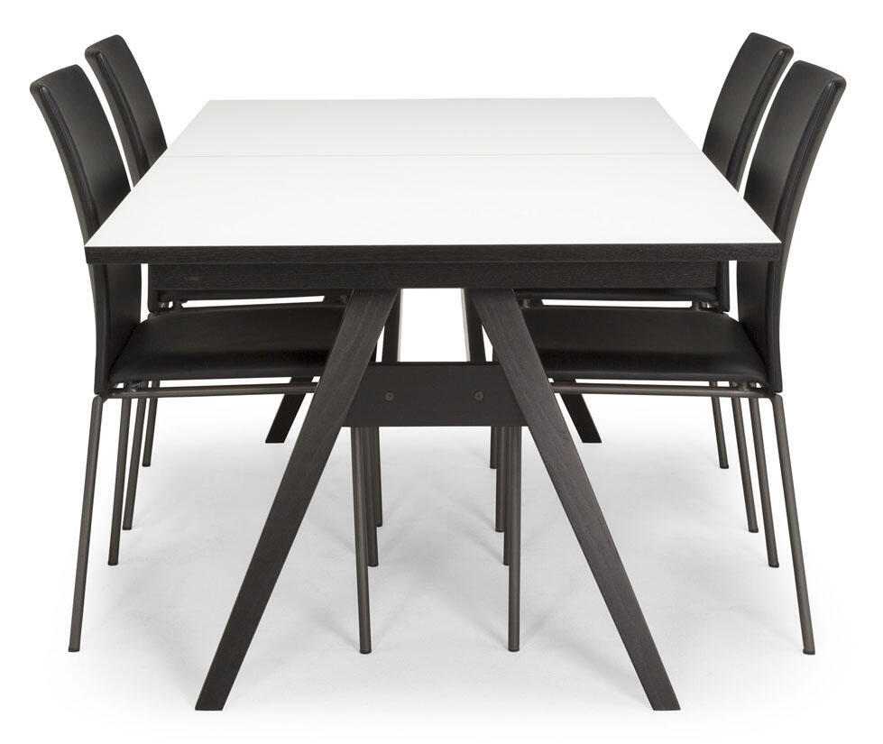 Matbordet Bornholm är ett stilrent och trendigt bord med smart mekanism. Iläggsskivorna förvaras inuti bordet, viks upp med ett lätt handgrepp. Med bordet maximalt utfällt får det plats 8 personer runt bordet. Bornholm matbord i vit laminat med svart kant och underrede L183/274 B100 H74 cm, inkl. 2 st iläggsskivor med butterflykonstruktion á 45 cm. Fyn stol i svart specialläder och borstad stål B45 D54 H92 cm. Matgruppen inkluderar bord och 4 stolar!