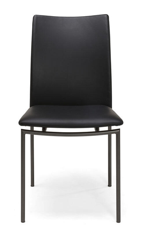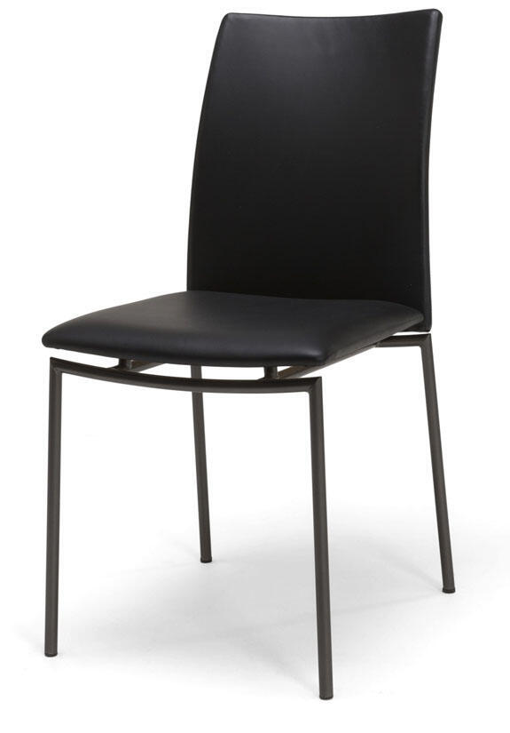 Svart underrede med vit skiva, stol i svart läder med borstad stål