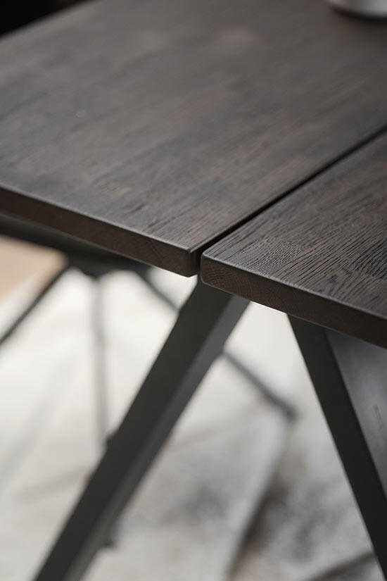 Carradale matbord 170x100 cm i brunoljad FSC-certifierad ek. Tvådelad massiv bordsskiva med borstad yta och V-formade ben i svart pulverlackad metall. De stilrena V-benen ger bordet ett luftigt intryck. Bordsskivan kan kompletteras med 1 eller 2 tilläggsskivor à 50 cm vilket kan göra bordet upp till 270 cm långt.