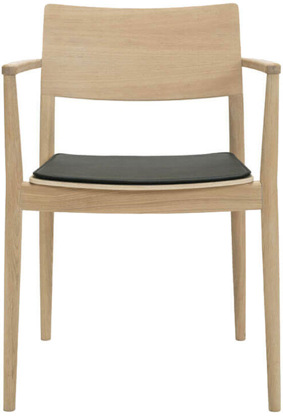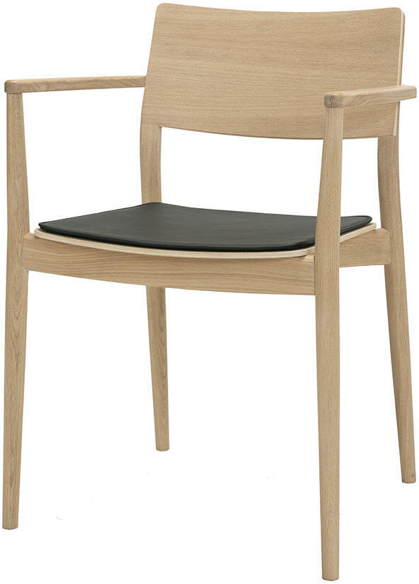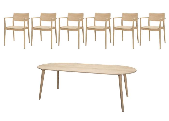 Den här matgruppen av möbelserien Clean består av ett stort bord och sex stycken karmstolar. Bordet har en rejäl och stabil konstruktion, helt tillverkad i massiv ek. Den elegant rundade bordsskivan och de smäckra benen ger en vacker design som passar väldigt väl till matstolarna. Stolarna i en blandning av ekfanér och massiv ek är bekväma som de är men för snyggast helhetsuttryck och bästa komfort rekommenderar vi att köpa till sittdynor i svart eller cognacsfärgat läder.