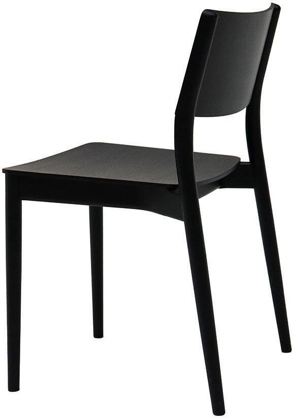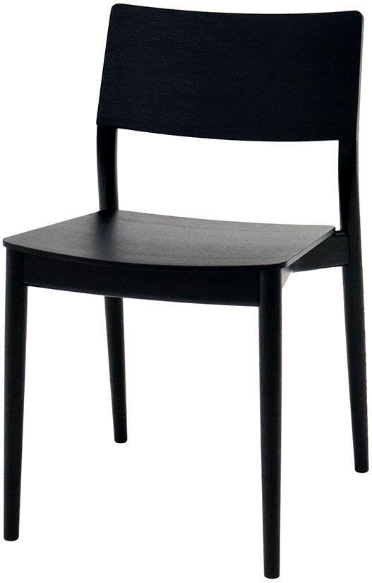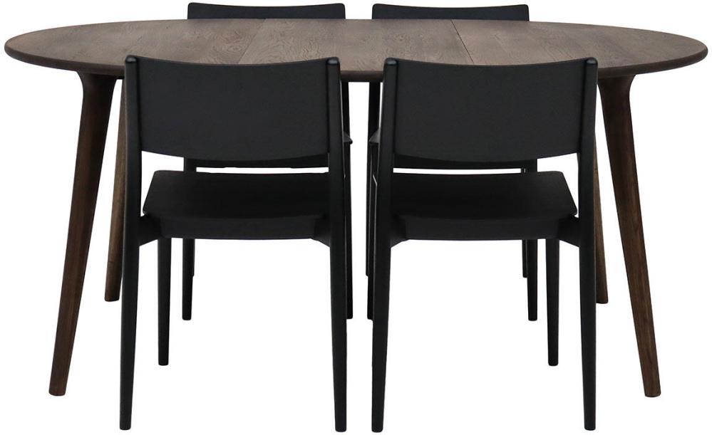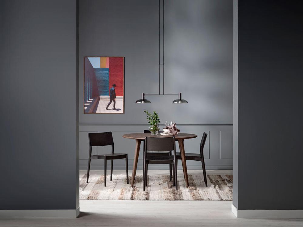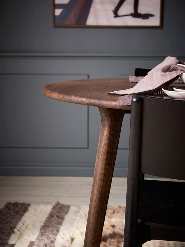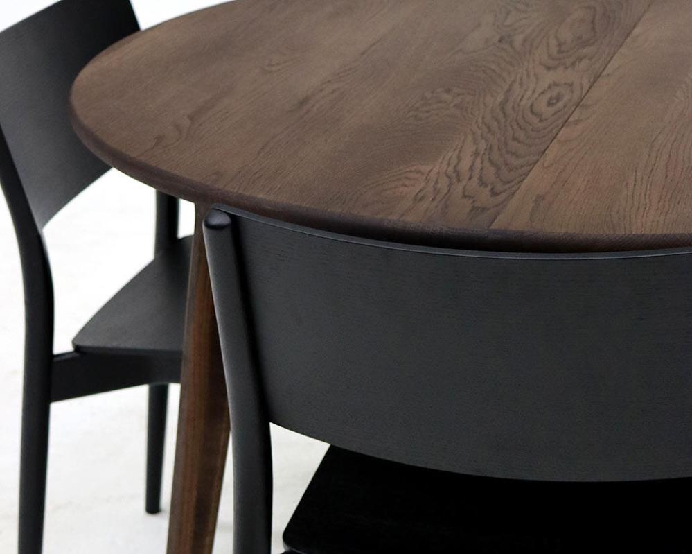 Bordet är tillverkat helt i massiv ek medan stolen har en blandning av massiv och fanérad ek. Det brunoljade matbordet matchas här med svartbetsade stolar och det vitoljade bordet matchas med stolar i samma ytbehandling.