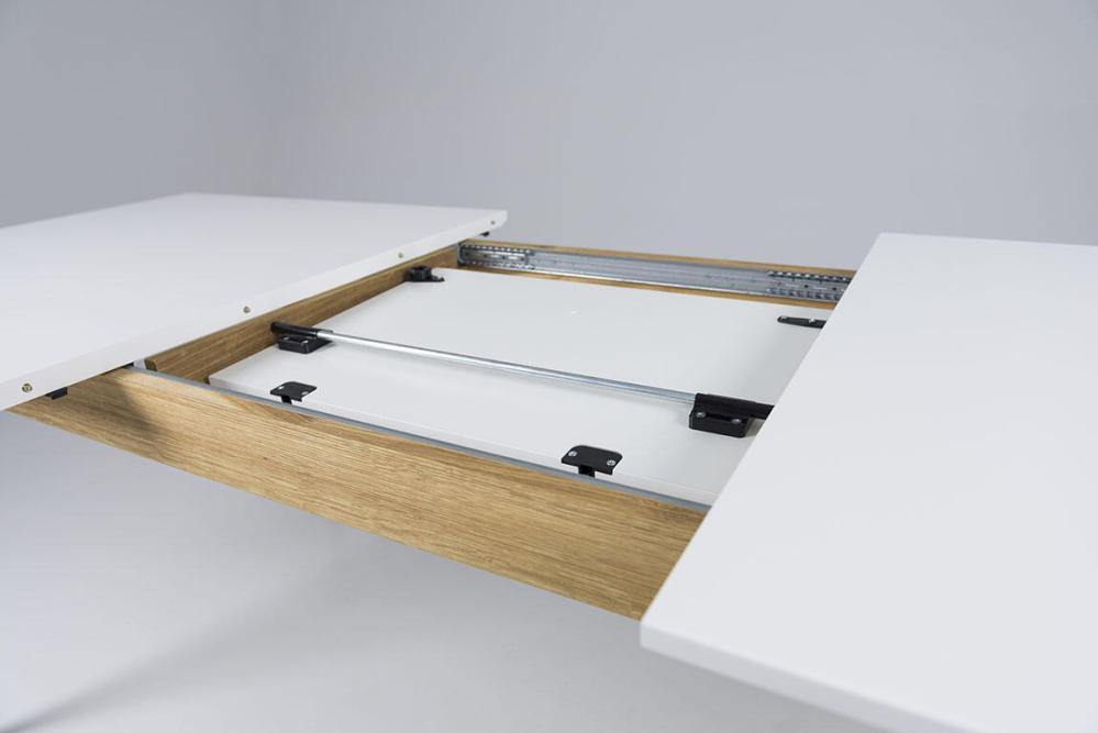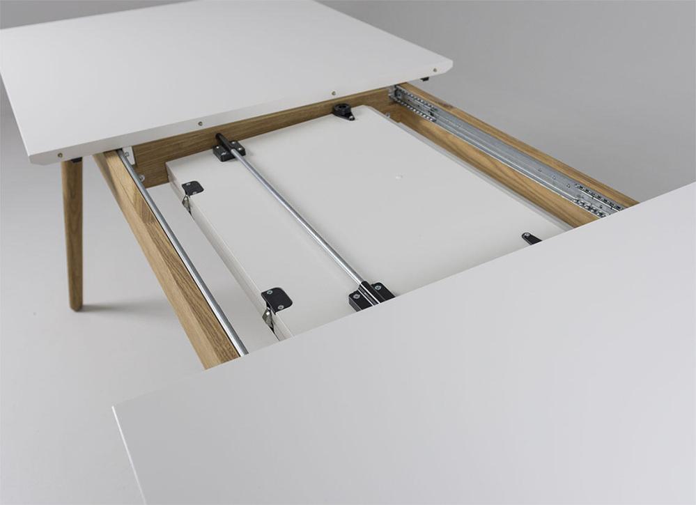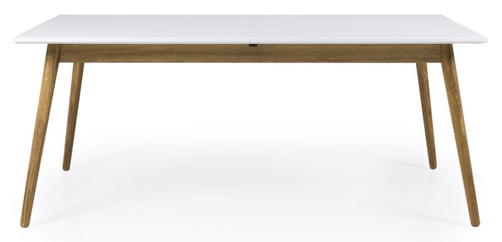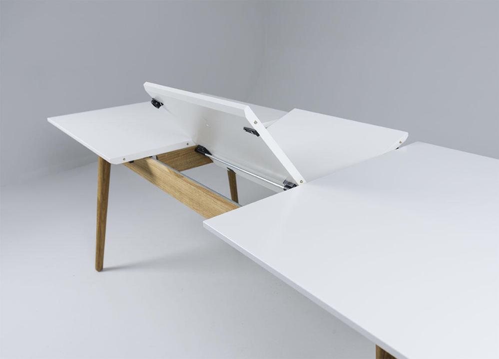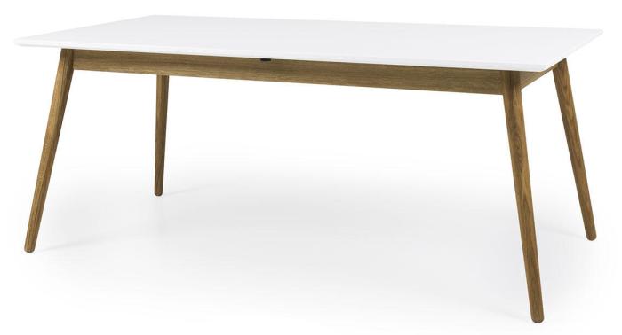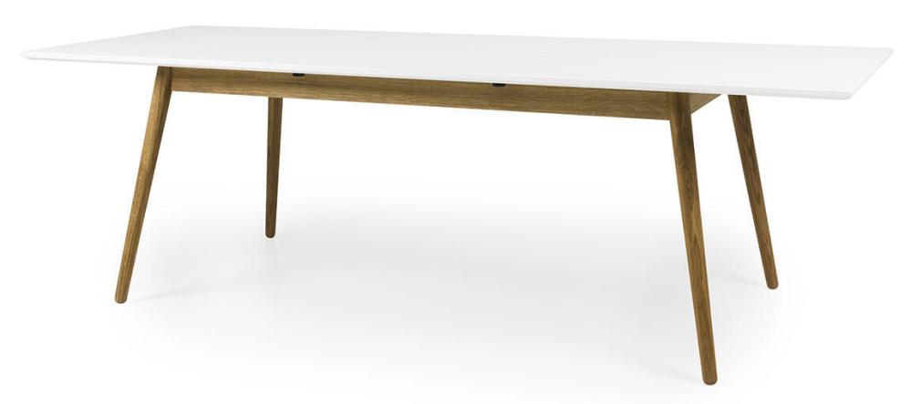 Dot med butterflyskiva är ett modernt och tåligt matbord i en kombination av massiv ek med en skiva i vitt. En kombination som ger ett tidlöst och vackert utseende.