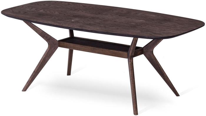 Elton har en väldigt vacker och elegant formgivning som ger ett mjukt och behagligt intryck. Bordsskivan har en fin avrundad form med vinklade ben, här bildas även en mindre underhylla för praktisk förvaring. Soffbordet är tillverkad i en blandning av massiv och fanérad ek som sedan har behandlats i en brunbetsad/rökt ek ton som ger en rustik känsla och modern finish. Det 50-talsinspirerande vardagsrumsbordet passar in i många av dagens inredningsstilar och hem.