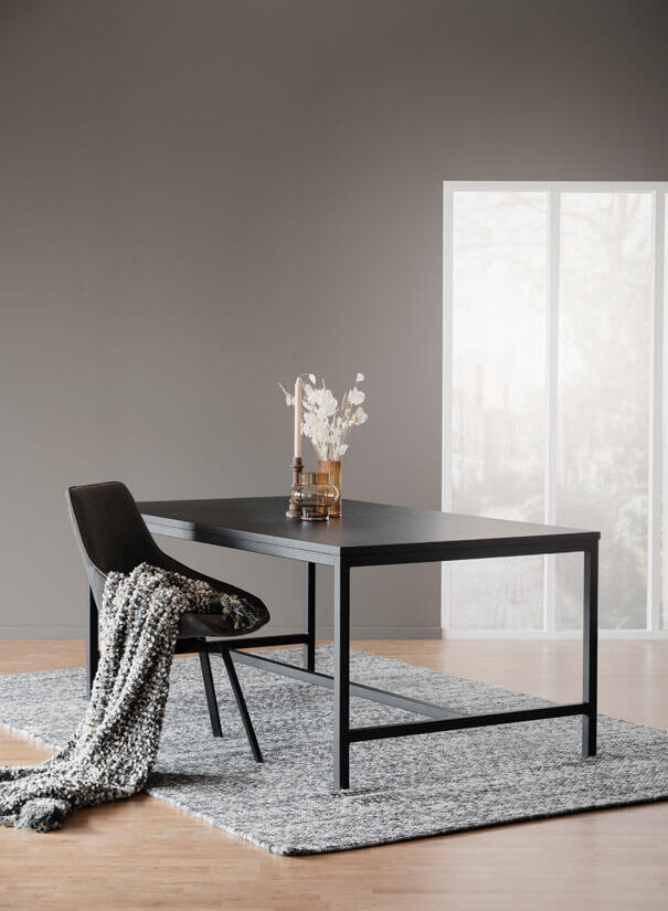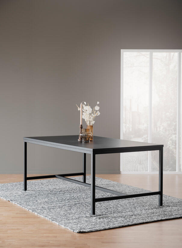 Everett matbord 220x100 cm i stilren och modern design. Matbordet har en massiv bordsskiva i svartlackerad europeisk ask med svarta pulverlackerade metallben med sandstruktur. Bordsskivan har en borstad och lackerad yta, kvistar kan förekomma. Bordet kan förlängas med upp till två tilläggsskivor á 50 cm, maxlängd med skivor 320 cm. Bordet Everett finns även i den mindre storleken 180x100 cm med samma möjlighet till förlängning. Borden ingår i möbelserien Everett designad av Rowico som även innehåller flera praktiska och stilrena förvaringsmöbler.