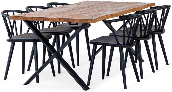 Här har vi en modern matgrupp från Torkelson bestående av det fina Exxet matbordet med X-ben och sex stycken Edda stolar som passar fint till. Bordet har en toppskiva tillverkad av tjock fanérad vildek på en MDF-skiva, välj på en ytbehandling av; smoked, oljad och vitoljad. Edda är en klassisk svart pinnstol i en modern tappning. Den skönt formade ryggen tillsammans med den stoppade ljusgråa sittdynan som ingår får du både en snygg som skön stol.