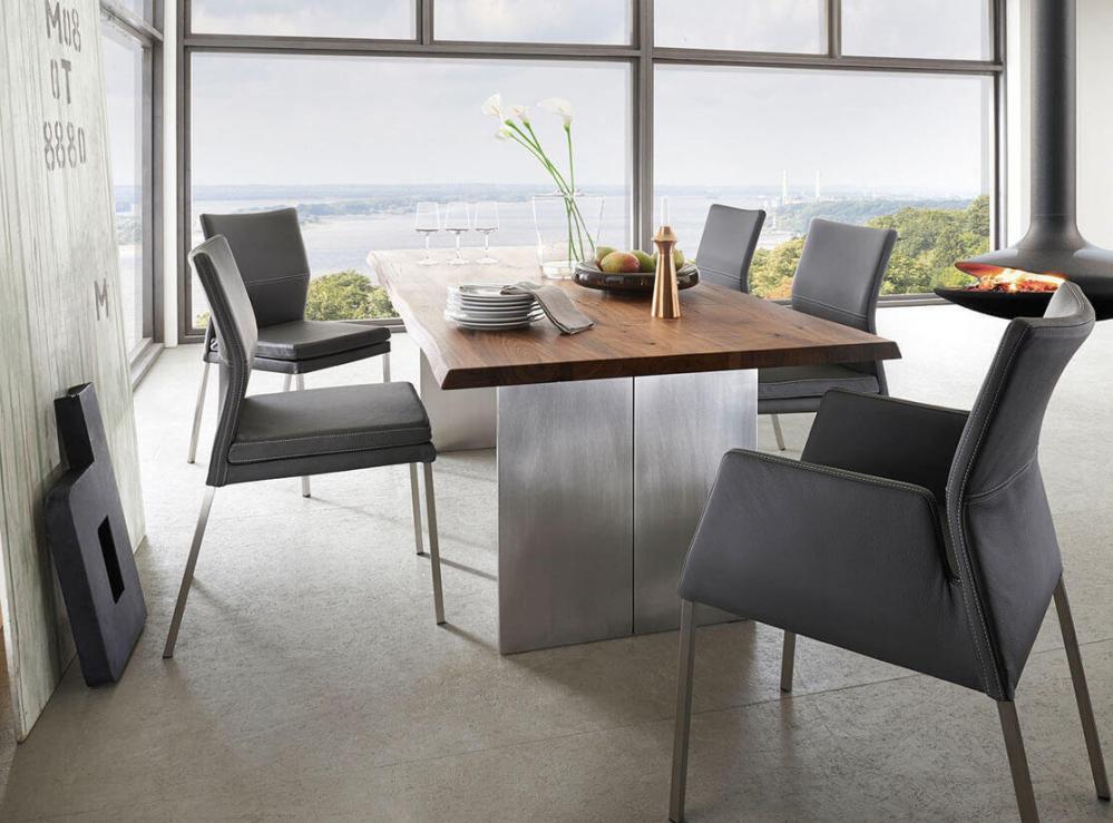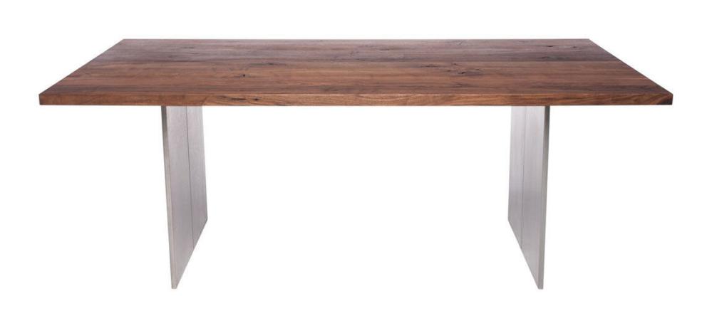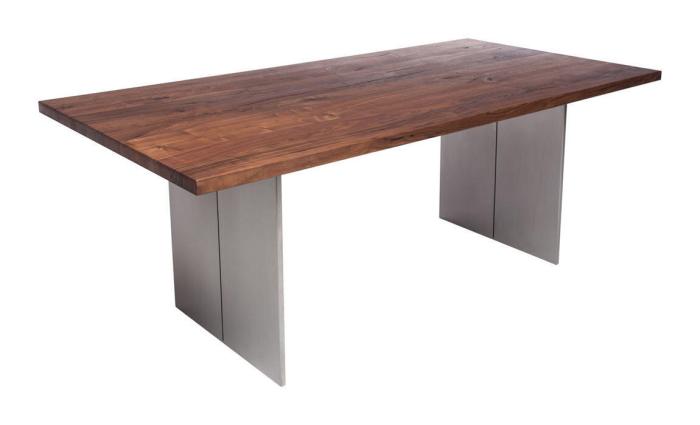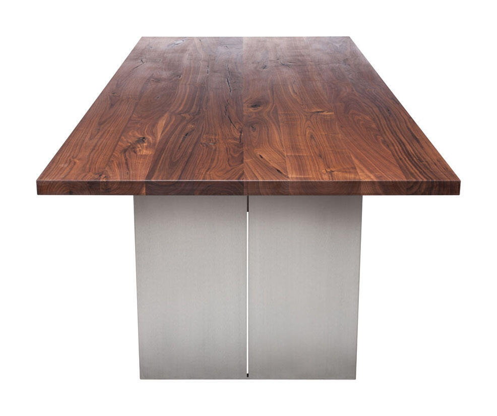 Borden tillverkas i Europa och är en harmonisk fusion mellan trä och metall i en modern stil. Bordsskivan kan fås i Europeisk ek eller Amerikansk valnöt och med möjlighet till en personlig utformning. Vidare kan det fås med hel eller delad skiva och med flera olika typer av bordskanter. Borden kan anpassas ytterligare efter din personliga smak genom att välja fyllnadsmaterial, eller genom att lämna kvistar och sprickor obehandlade för en mer rustik känsla. Bordsskivan oljas in för att ge både en slitstark och vacker yta. Kontakta oss om du istället önskar en klarlackad yta.