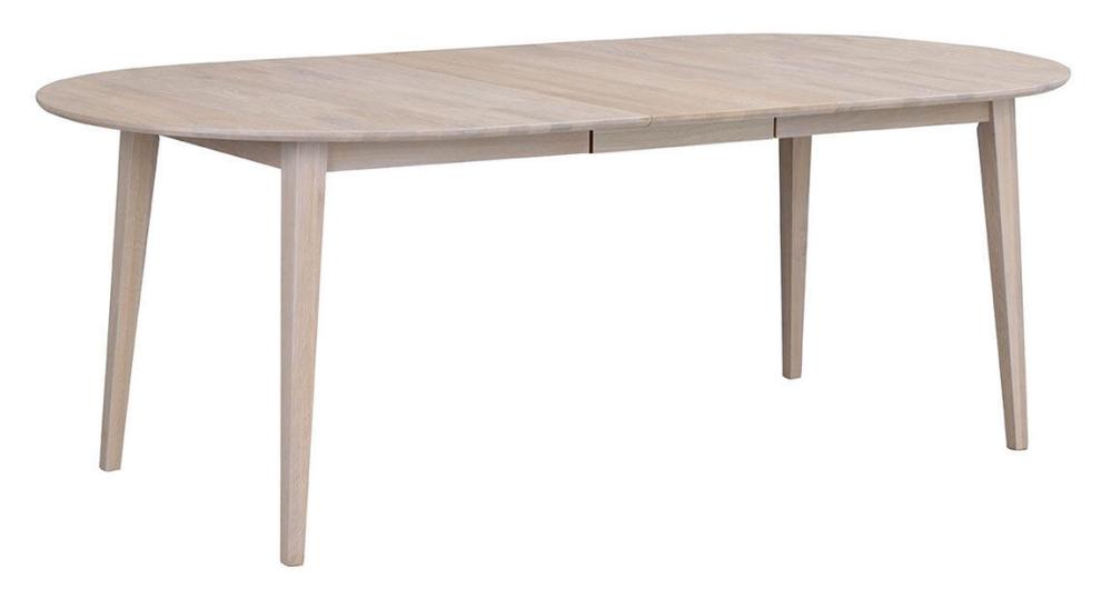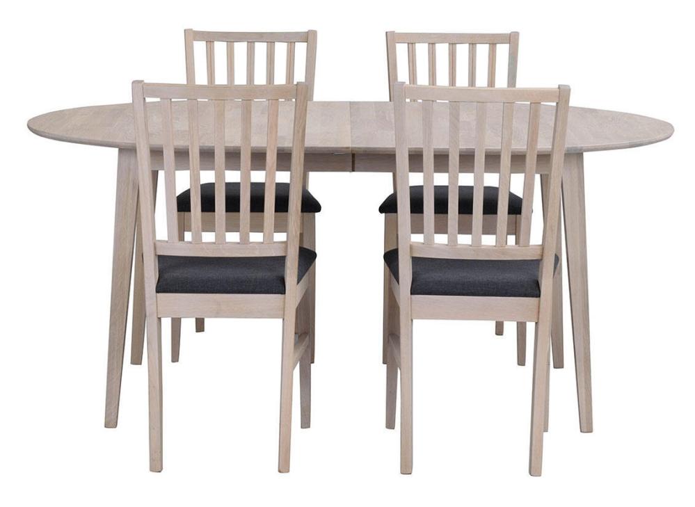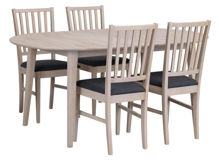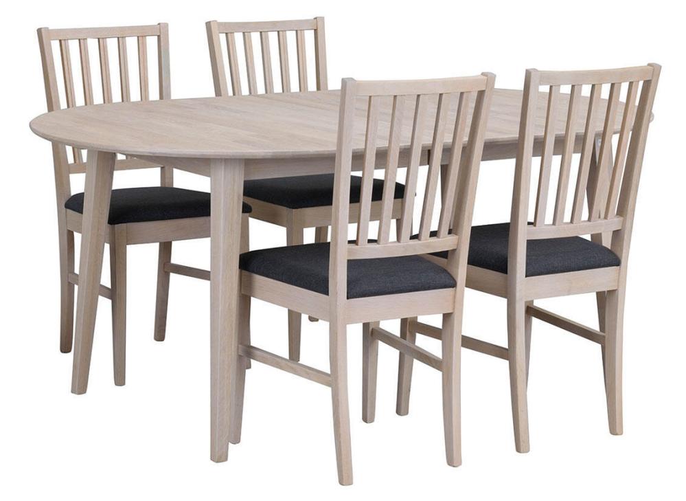 Filippa ovalt matbord 170-210x105 cm i avskalad och stilren design. Bordet är i vitpigmenterad ek med en tillhörande iläggsskiva. Bordet kan även kompletteras med ytterligare en iläggsskiva. Med två iläggsskivor blir bordet 250 cm. Tillsammans med bordet ingår fyra stycken trästolar Filippa i tidlös och skandinavisk design. Stolen är i vitpigmenterad ek med dekorativ stoppad sits med grått tyg. Stolen levereras monterad. Matgruppen ingår i serien Filippa, i serien finns fler storlekar av matbord, stolar och förvaringsskåp.