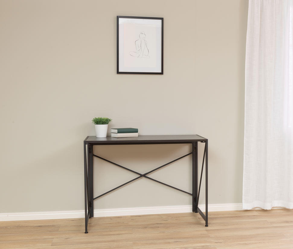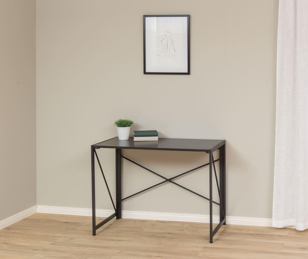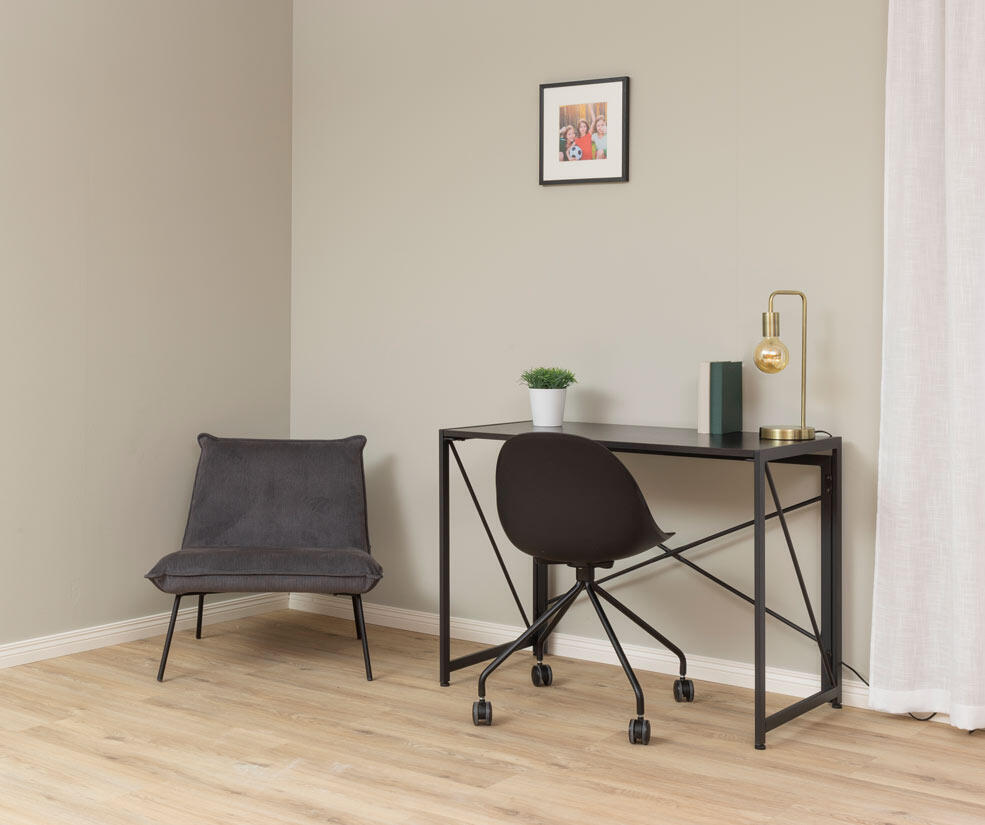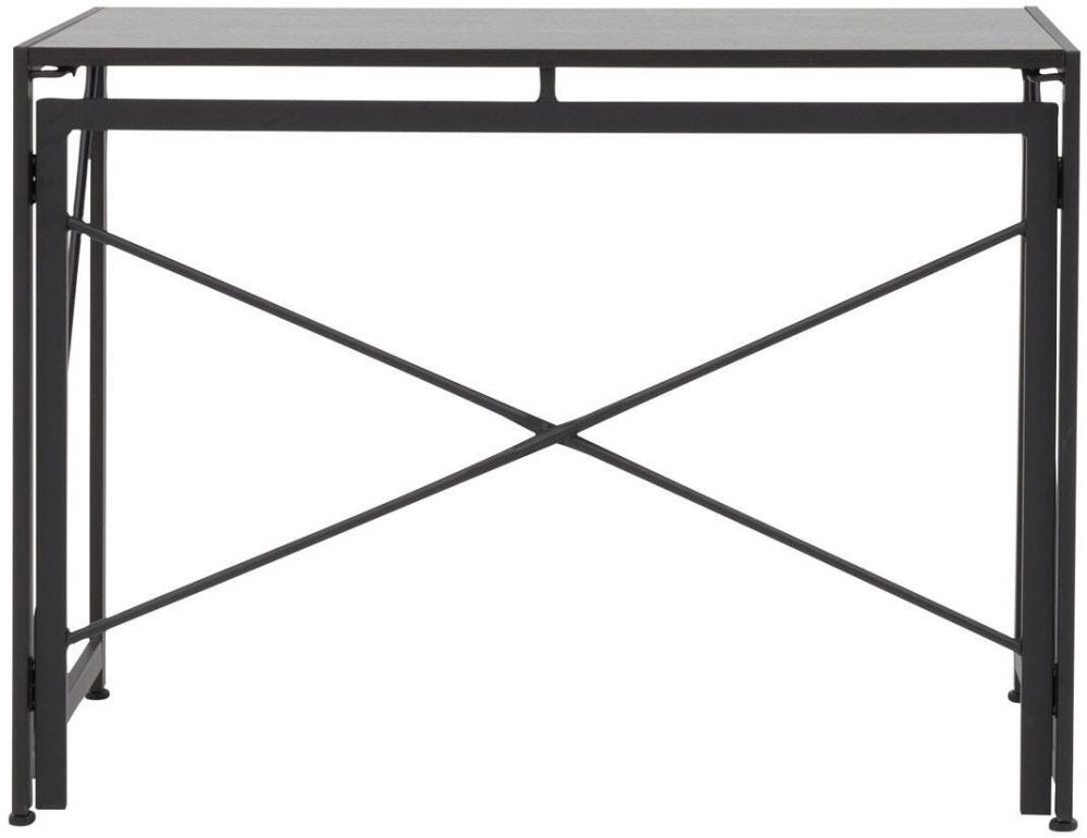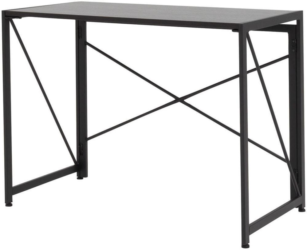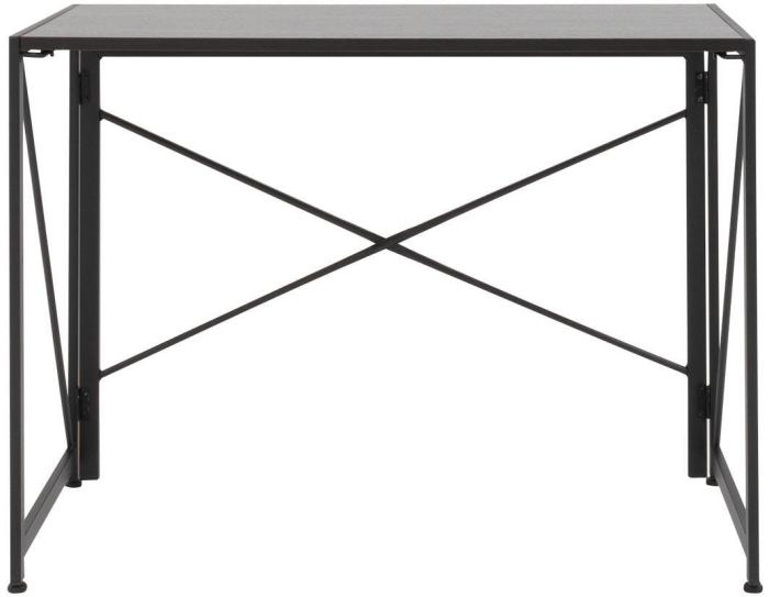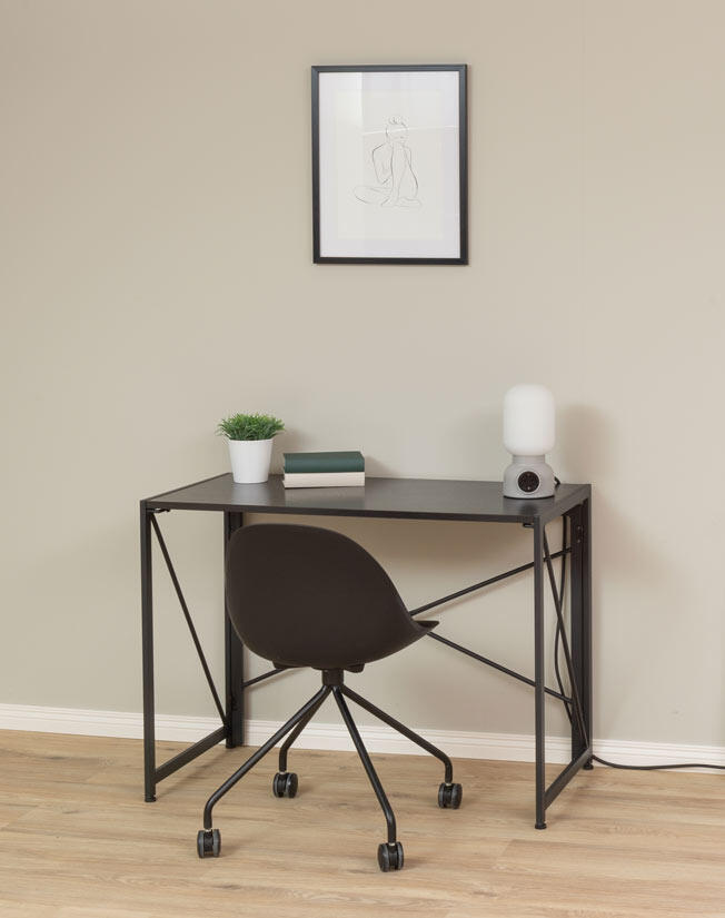 Kontorsbordet Fold har svarta pulverlackerade metallben och en robust bordsskiva av svart askfanér.