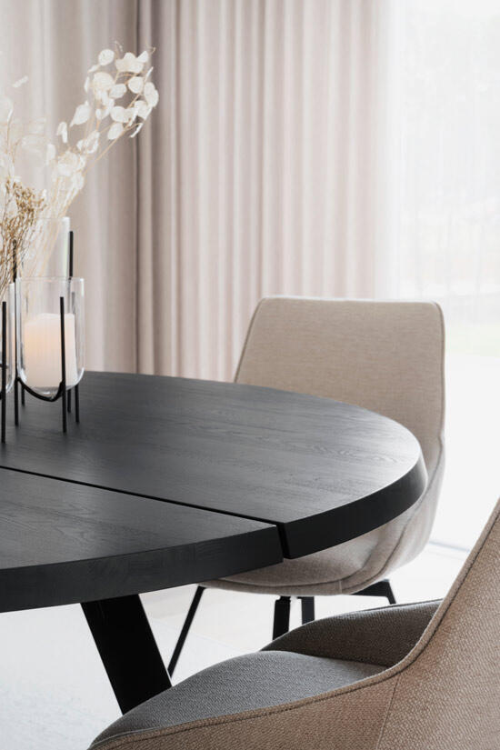 Matbordet Fred i 160 cm runt utförande har en borstad bordsskiva som sedan mattlackats. Skivan finns i tre färger: Mörkbrun ek, Vitpigmenterad ek eller Svartbetsad ask, alla med svartlackerade rektangulära metallben. De sex stolarna som ingår i paketet finns även de i tre färger: tyget Asgard i Beige eller Grått alternativt ett microfibertyg i Mörkgrått. Vilken kombinationen passar dig och ditt hem bäst?