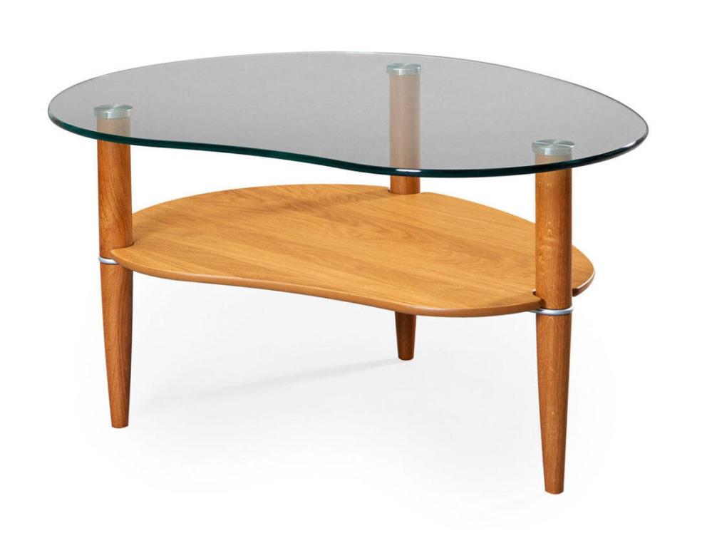Härdad glasskiva. Hyllplan träfaner. Ben i massiv trä.