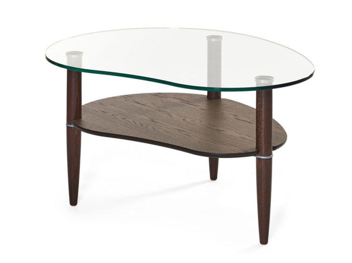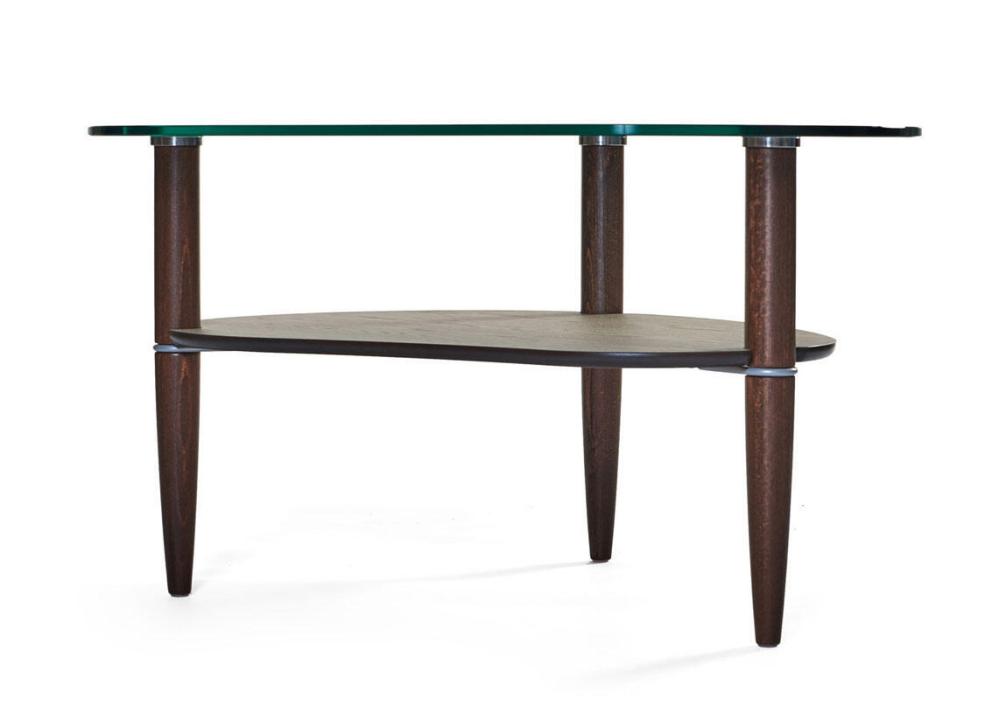 Härdad glasskiva. Hyllplan träfaner. Ben i massiv trä.