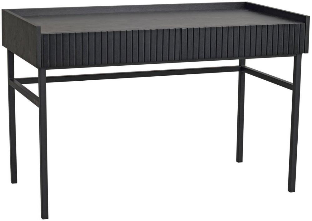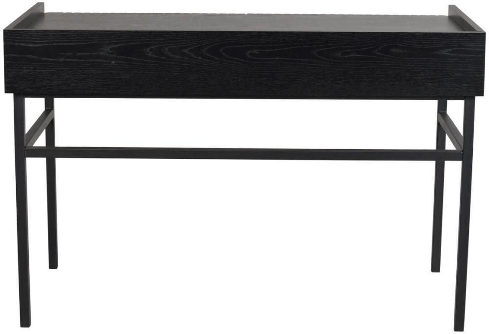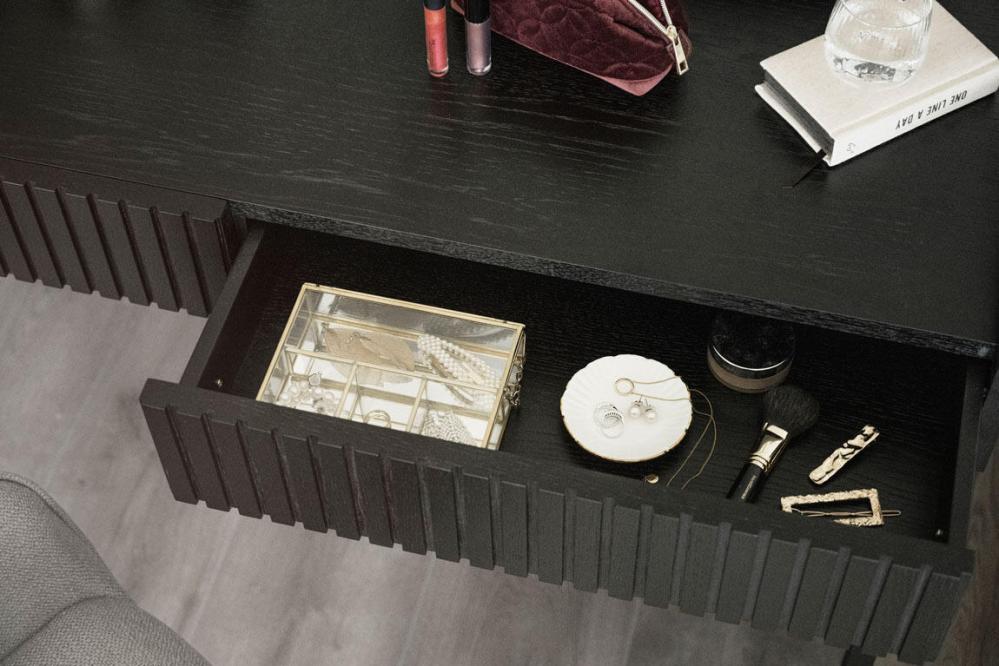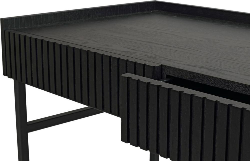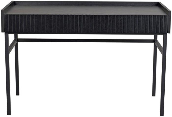 Halifax skrivbord passar perfekt till det stilrena hemmakontoret eller som sminkbord i sovrummet. I skrivbordet finns två utdragbara lådor med dolda hål förberett där du själv väljer om du vill montera de medföljande guldfärgade knopparna i borstad metall. Skrivbordet har även en praktisk sarg runt bakre delen av bordskivan som skapar avskildhet och skydd åt papper och annat.