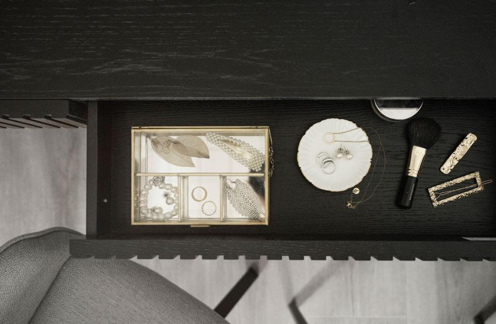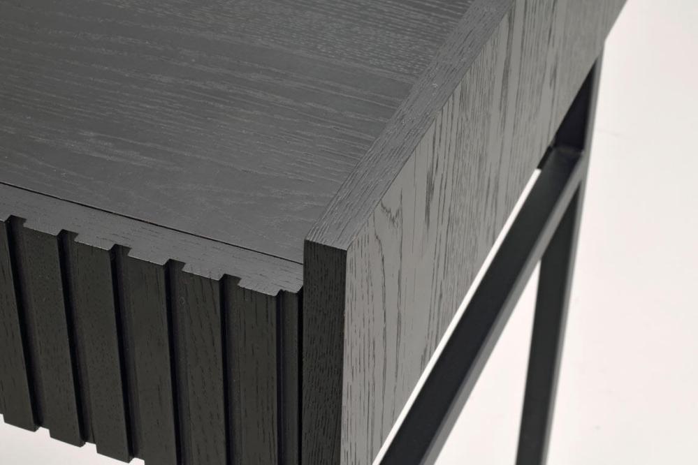 Ekfanér på MDF, svartlack. Metallben i pulverlack, knopp i guldfärgad borstad metall
