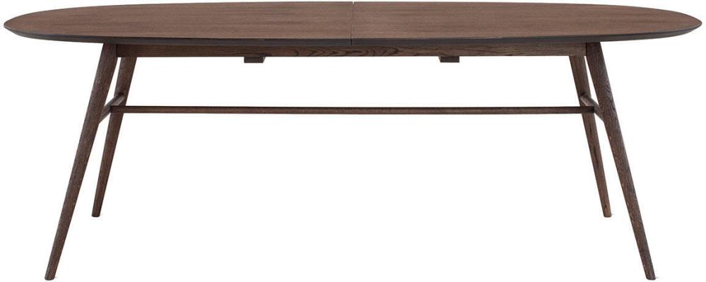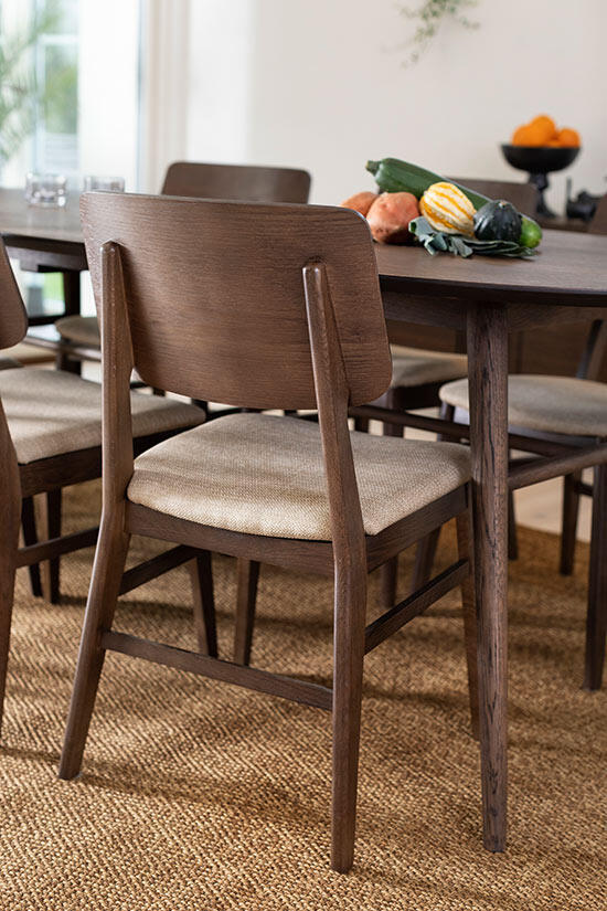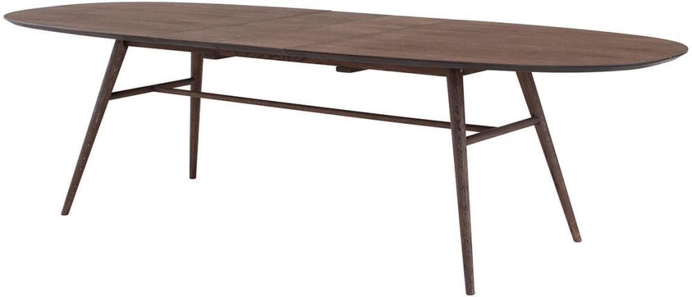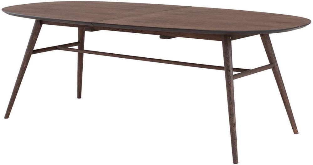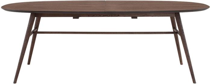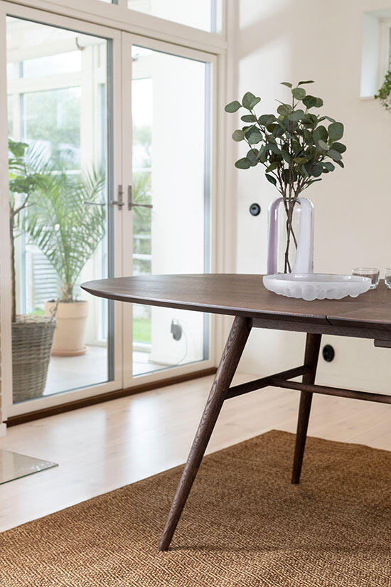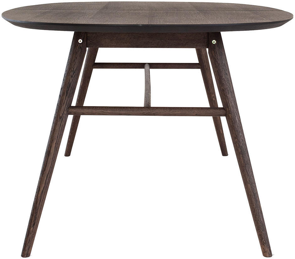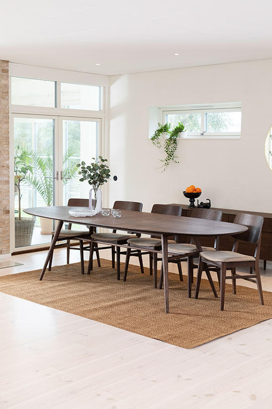 Matbord Joel har en stilren och modern design med en oval toppskiva som gör sig bra tillsammans med de svarvade benen som ger ett mycket elegant utseende. Bordsskivan är i fanérad ek medan benen är i massiv ek, båda i en väldigt vacker ytbehandling av rökbetsad ek med en mattlack.