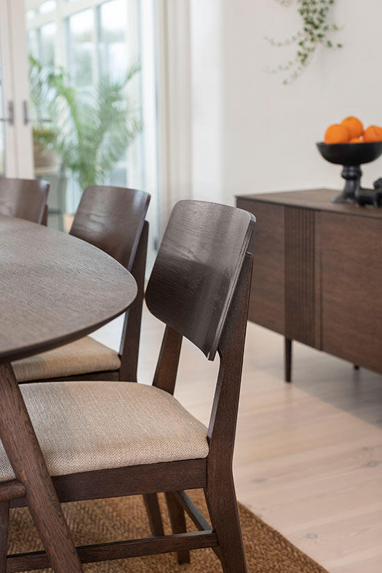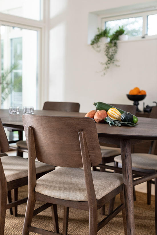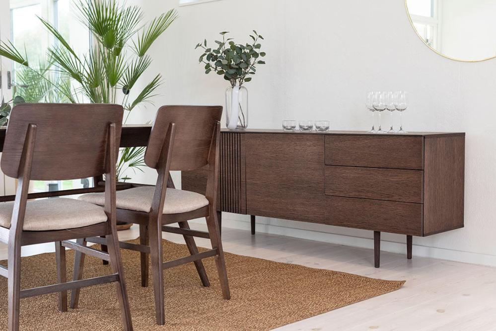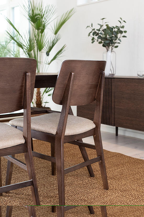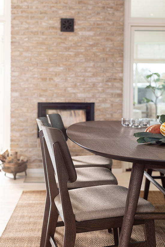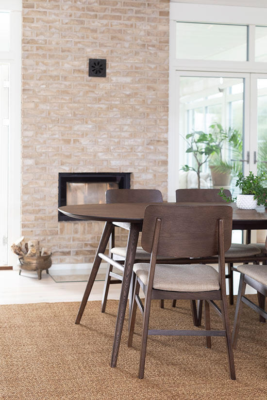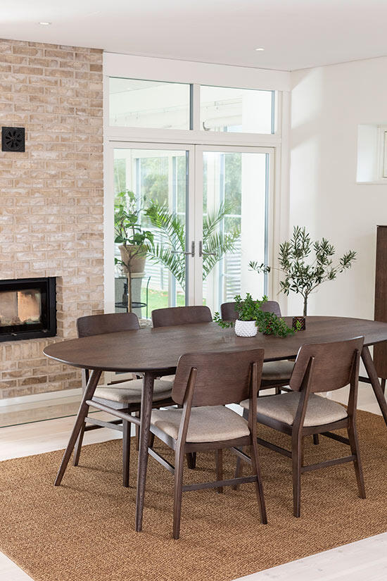 Matbord Joel har en stilren och modern design med en oval toppskiva som gör sig bra tillsammans med de svarvade benen som ger ett mycket elegant utseende. Bordsskivan är i fanérad ek medan benen är i massiv ek, båda i en väldigt vacker ytbehandling av rökbetsad ek med en mattlack.