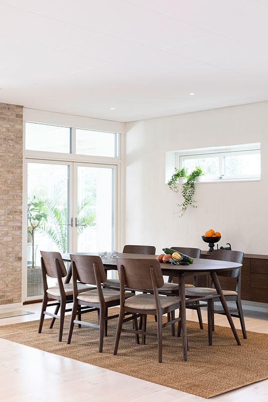 Matbordet är som standard 220 cm långt, med en skiva blir bordet 250 cm och med det maximala antalet av iläggsskivor (2 stycken) blir bordet hela 280 cm.