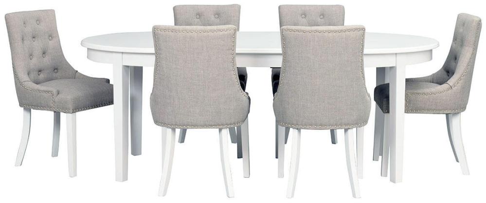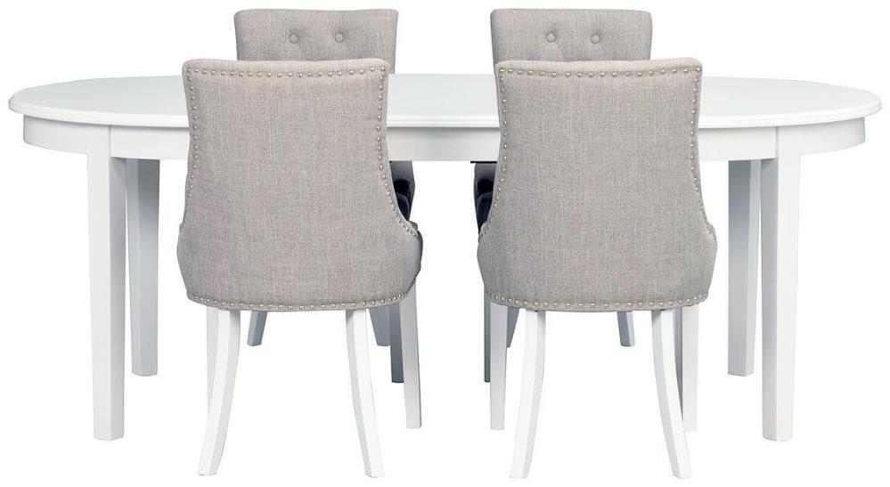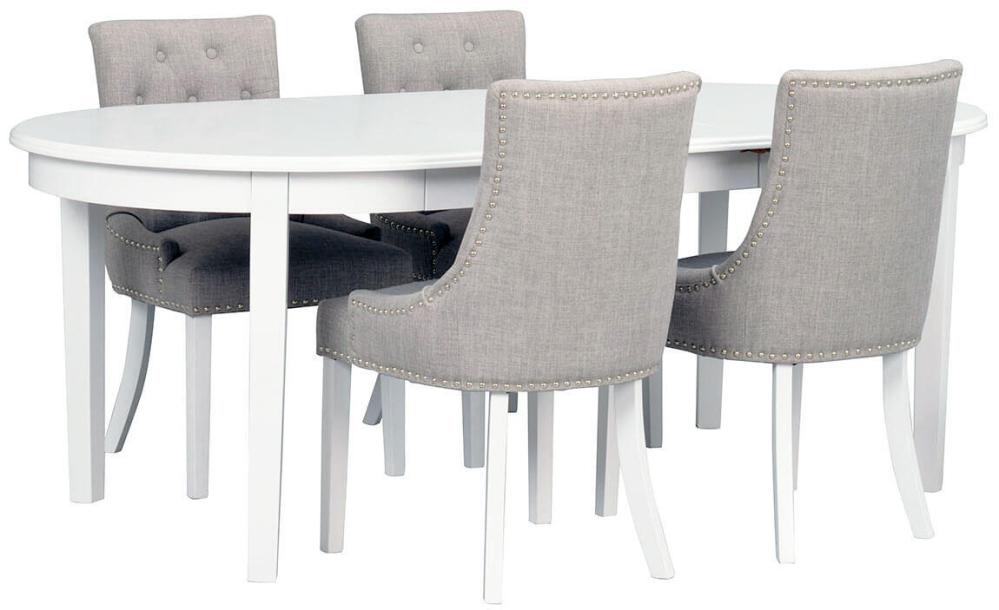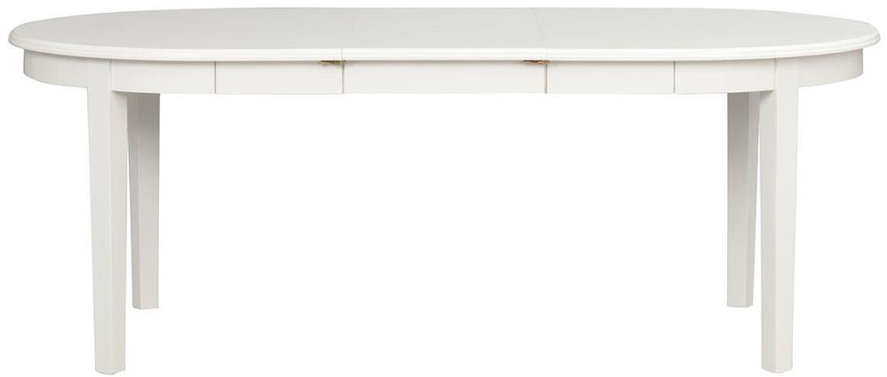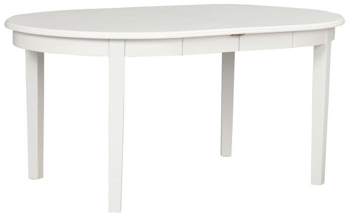 Koster är en serie vitlackade matbord i klassisk och tidlös design. Bordsskiva i MDF med dekorativa och funktionella utdragsbrickor på kortsidorna. Detta ovala bord kan bli upp till 253 cm långt, som utgångsläge är bordet 163 cm där två stycken iläggsskivor á 45 cm ingår i priset.