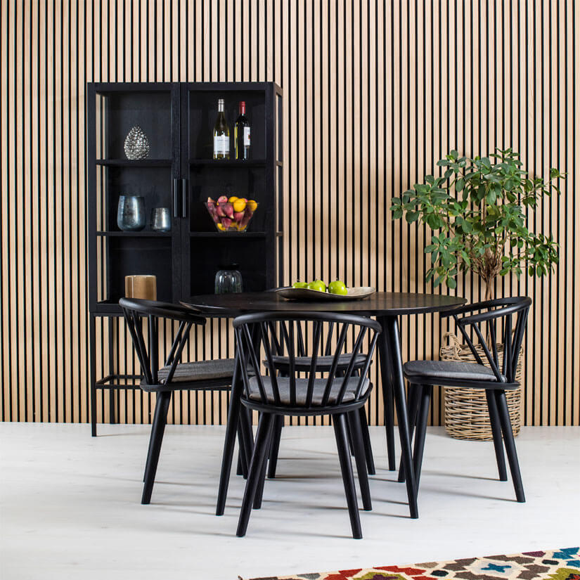 Miles är en trendig serie matbord i modern design som passar in i många hem och miljöer. Det runda köksbordet från Torkelson har en bordsskiva av högtryckslaminat med betongfinish alternativt brun- eller svartlaserad askfanér, till bordsskivan kan en svart mattlackad trumpetfot av metall eller fyra träben väljas. Borden finns i två storlekar, 80 och 110 cm. Miles passar bra i det mindre köket tack vare sin nätta design och rymmer med god marginal fyra stolar.