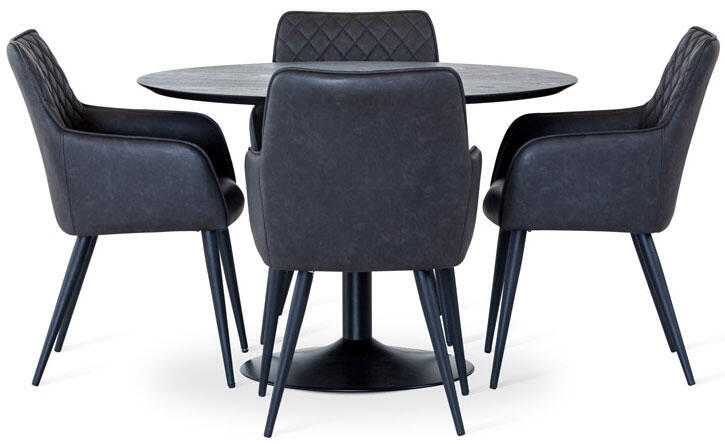 Miles är en trendig serie matbord i modern design som passar in i många hem och miljöer. Det runda köksbordet från Torkelson har en bordsskiva av högtryckslaminat med betongfinish alternativt brun- eller svartlaserad askfanér, till bordsskivan kan en svart mattlackad trumpetfot av metall eller fyra träben väljas. Borden finns i två storlekar, 80 och 110 cm. Miles passar bra i det mindre köket tack vare sin nätta design och rymmer med god marginal fyra stolar.