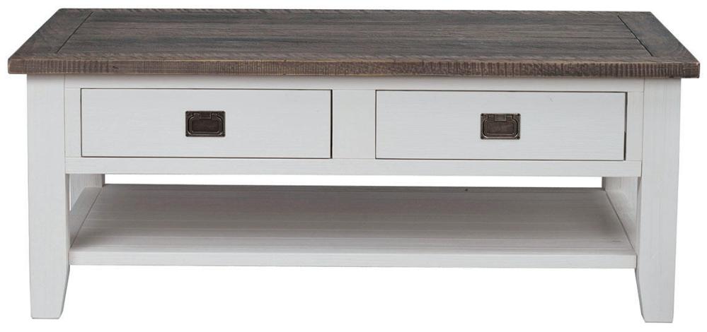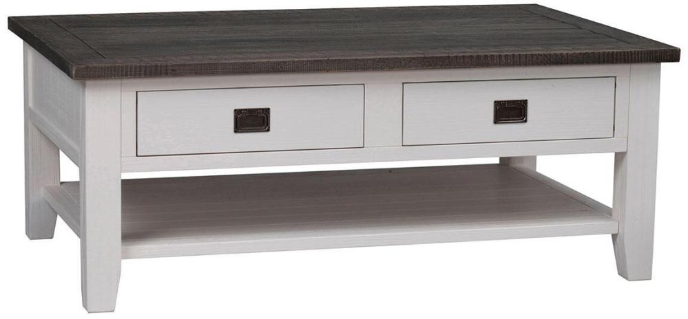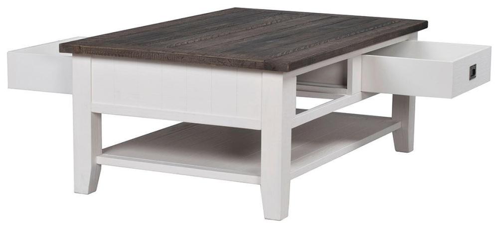 Nottingham soffbord med genomgående lådor och en kontrasterande toppskiva i brunbetsad massiv furu med ben i vitlack. Stort och stabilt vardagsrumsbord med gott om utrymme för magasin, brädspel och fredagsmys.