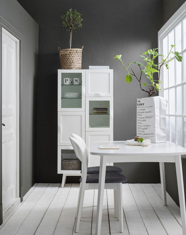 Pris inklusive 1 iläggsskiva på 48 cm. Bordet finns i tre storlekar, flera träslag och färger.