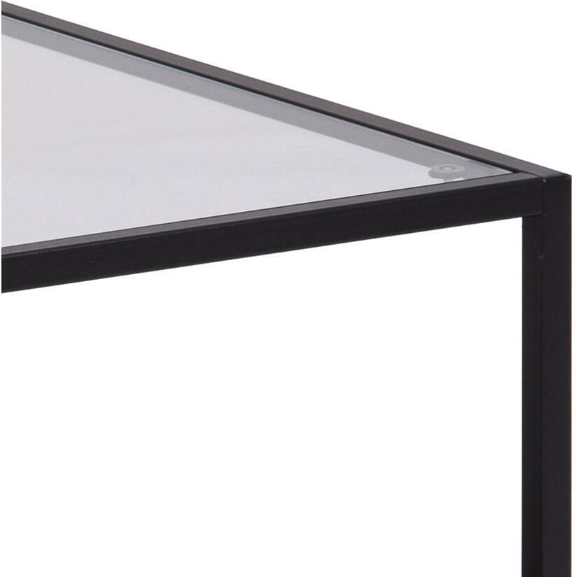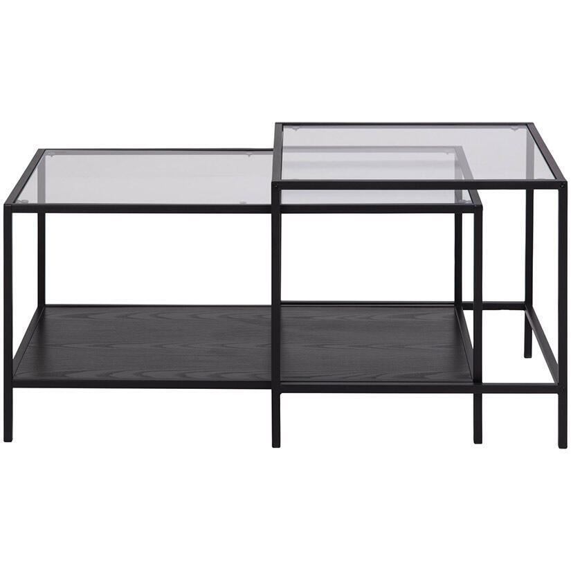 Seaford är en bred möbelserie med bland annat detta satsbord med en snygg kombination av glas, svart melamin och pulverlackad mattsvart metall.