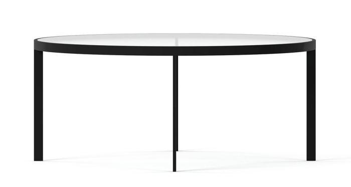 Soffbord Square här i runt 93 cm utförande. Möbelserien Square kännetecknas av en ram i plattjärn i svart pulverlack med skiva i antingen glas eller trä. Träskivorna finns i färgen Black Oak eller Burned Walnut.