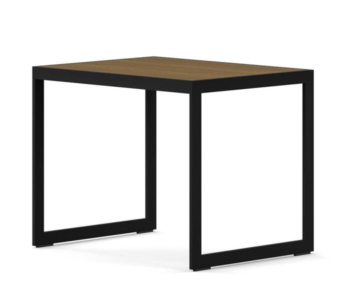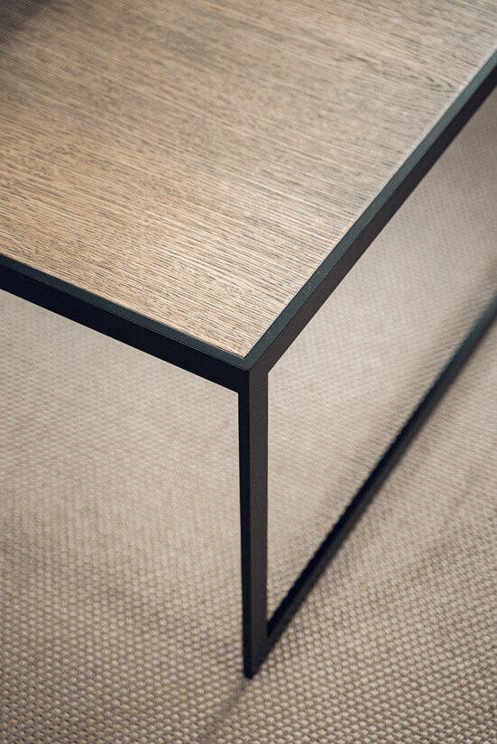Metallbord tillverkad av plattjärn i svart med träskiva i Black Oak eller Burned Walnut alternativt skiva av glas, Metallbord tillverkad av plattjärn i svart med träskiva i färgen Burned Walnut