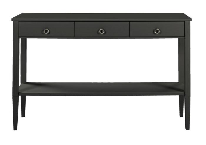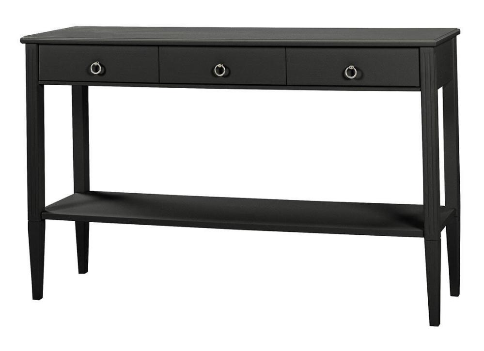 En av delarna ur serien är detta avlastningsbord med tre lådor och en praktisk underhylla för favoritmagasinen och andra småprylar. Sidobordet tillverkas av FSC-certifierad massiv furu med miljövänlig MDF. Möbeln har sedan handmålats för hand i svart, grå eller vit.